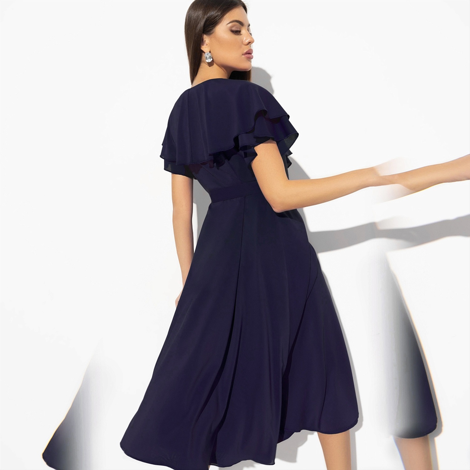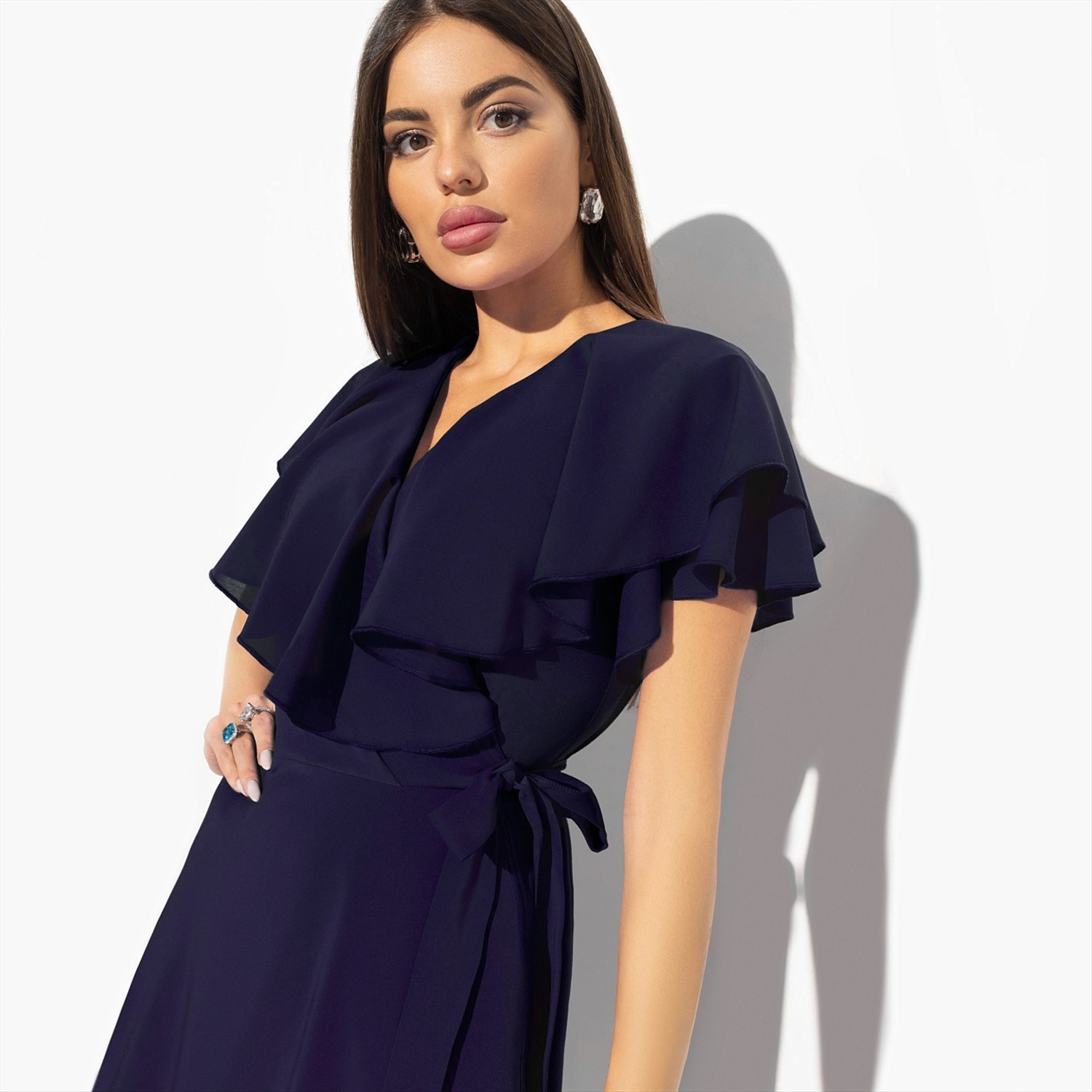 ТН ВЭД: 6204430000; Состав: «Креп-шифон» (98% п/э, 2% спандекс); Плотность ткани: Тонкая; Тип ткани: Текстиль; Вид застежки: Пояс; Декоративные элементы: Воланы; Карманы: Нет; Основной цвет ткани: Синий; Отрезная талия: Есть; Подклад: Есть; Резинка по талии: Есть; Рисунок/раппорт: Нет, все изделия идентичны; Сезон: Круглогодичный; Силуэт: Приталенный