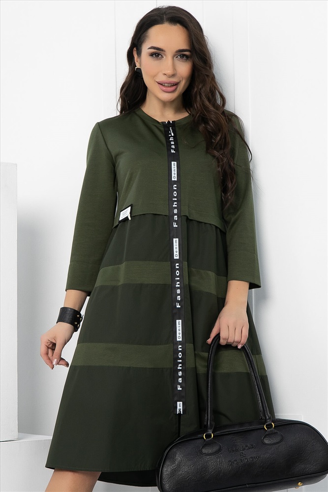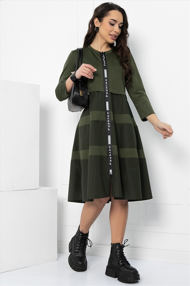 Повседневное платье в стиле спорт-шик, выполненное из сочетания плотного трикотажа и плащевки. Платье отрезное по линии талии, юбка состоит из ярусов. Такой фасон прекрасно подойдёт для повседневных мероприятий, будет хорошо сочетаться как с обувью на плоской подошве, так и с каблуком. Плащевка неприхотлива в уходе, любые брызги или капли с неё можно удалить обычной влажной салфеткой. Молния по всей длине платья также является декоративным элементом.