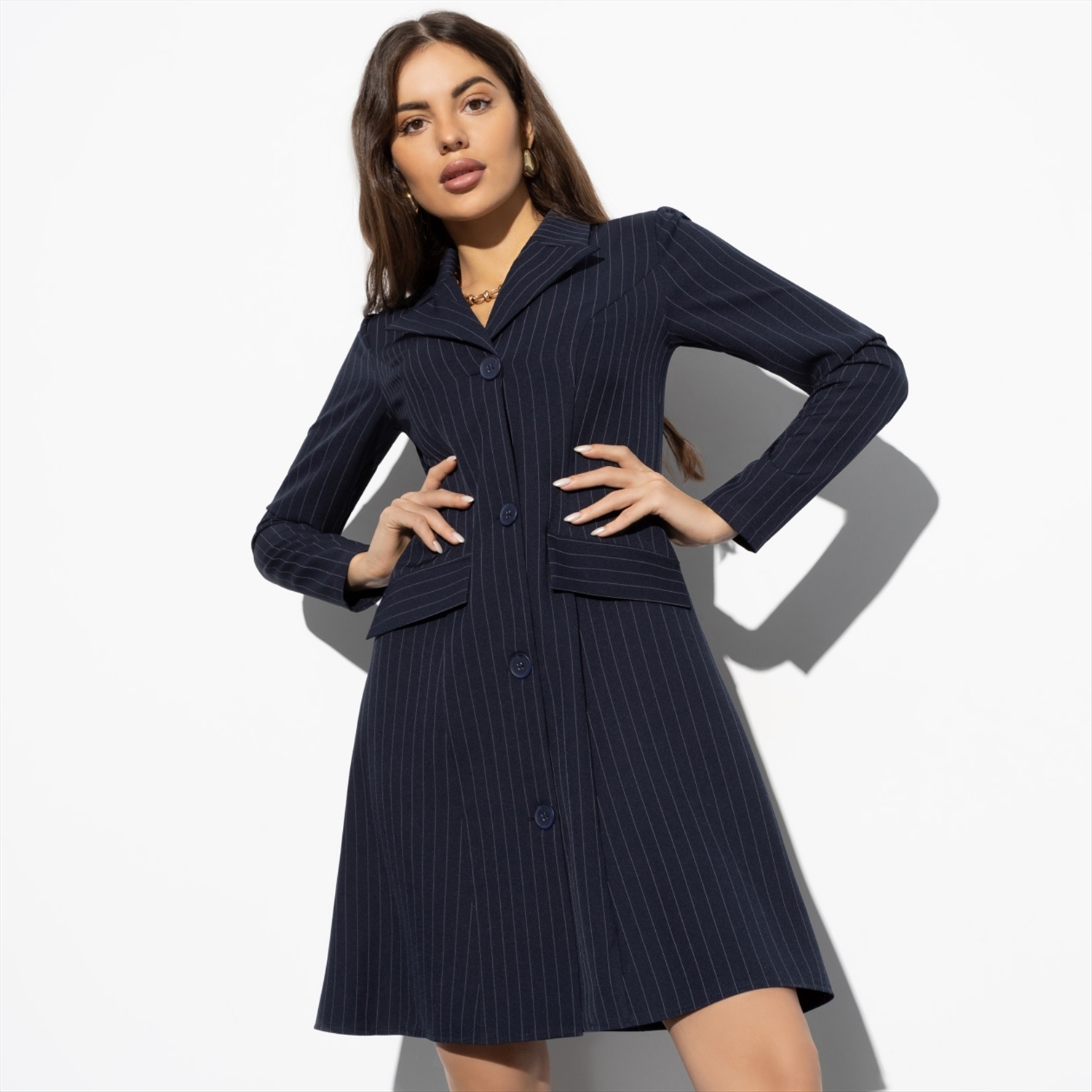 ТН ВЭД: 6204430000; Состав: Костюмная ткань «полоска» (60% п/э, 37% вискоза, 3% спандекс); Плотность ткани: Средняя; Тип ткани: Текстиль; Вид застежки: Пуговица/-ы; Карманы: Нет; Основной цвет ткани: Синий; Отрезная талия: Нет; Подклад: Нет; Резинка по талии: Нет; Рисунок/раппорт: Каждое изделие уникально из-за расположения рисунка на ткани; Сезон: Круглогодичный