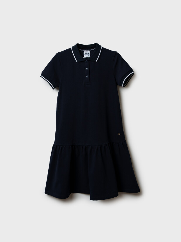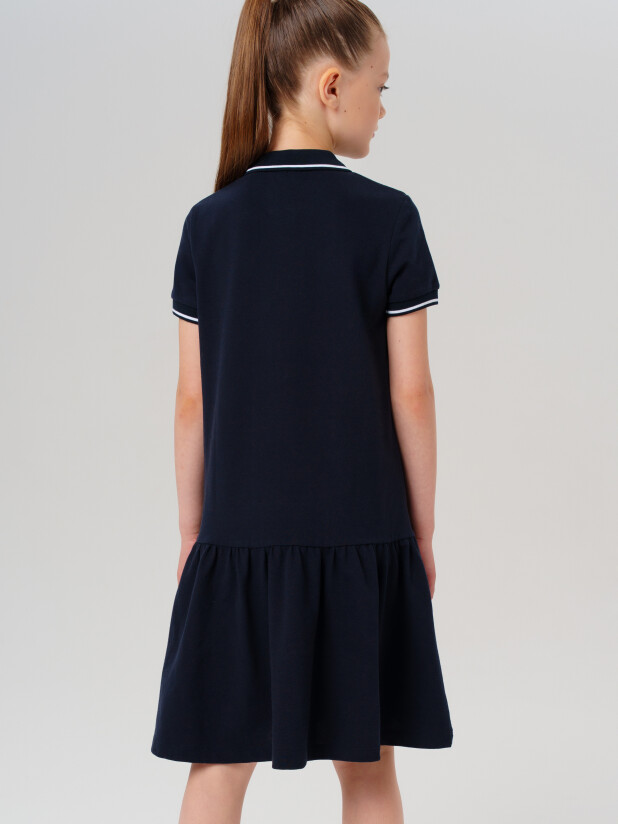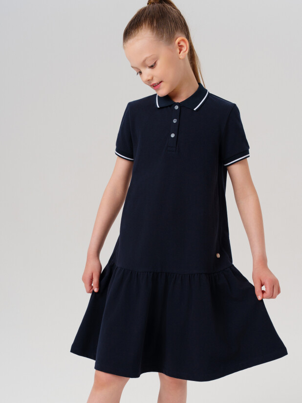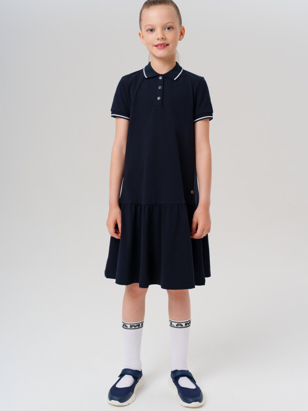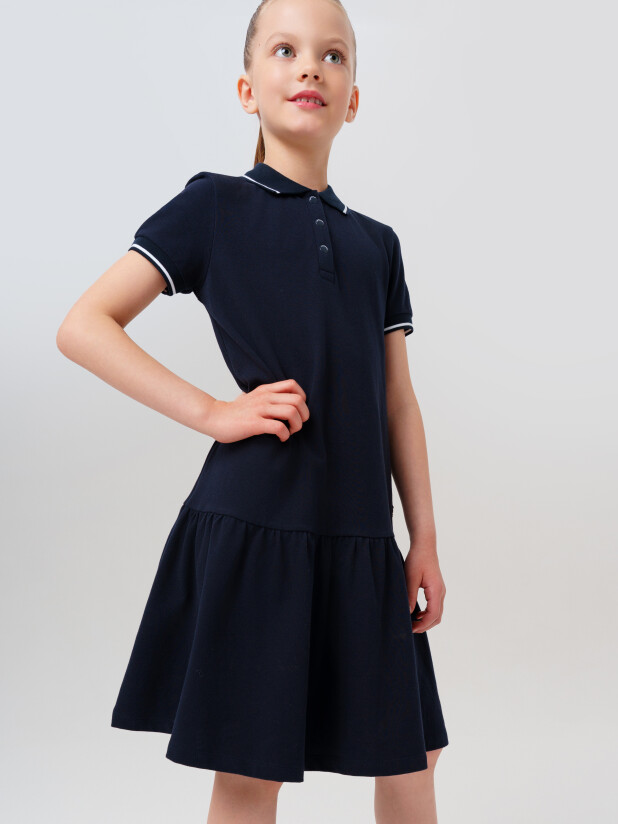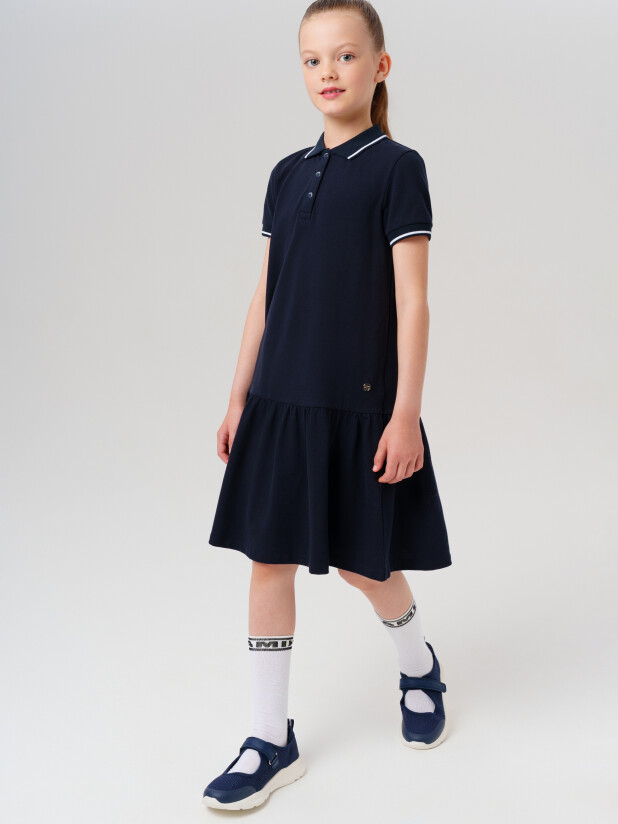 Такое классическое платье поло для подростков станет любимой вещью в гардеробе: не требует сложных сочетаний, подходит под школьные требования, а благодаря оборке по низу образ получается одновременно строгим и девчачьим.