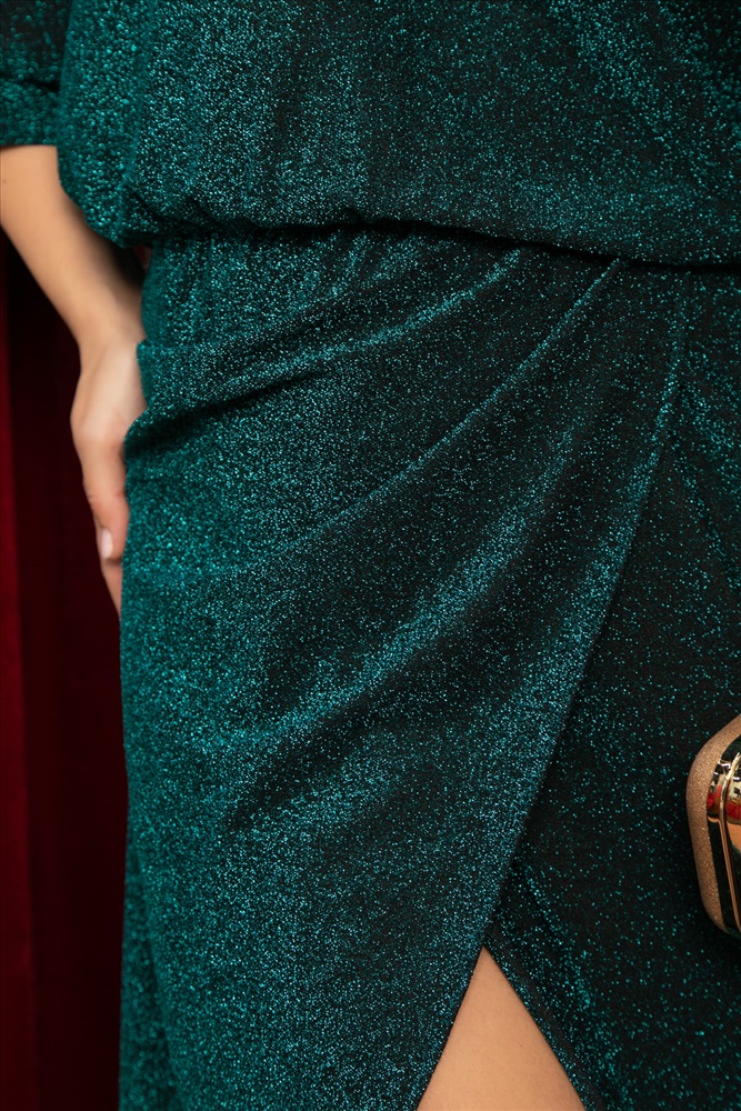 Прекрасное платье в изумрудном цвете станет вашим лучшим спутником на любом торжественном мероприятии. Верх платья скроен по типу «летучая мышь», что обеспечивает свободу движений. Юбка на запах в стиле тюльпан идеально подчеркивает фигуру, а резинка по талии добавляет дополнительный комфорт. В комплект входит пояс из основной ткани. Это эффектное платье подчеркнет вашу индивидуальность и станет ярким акцентом любого торжества.