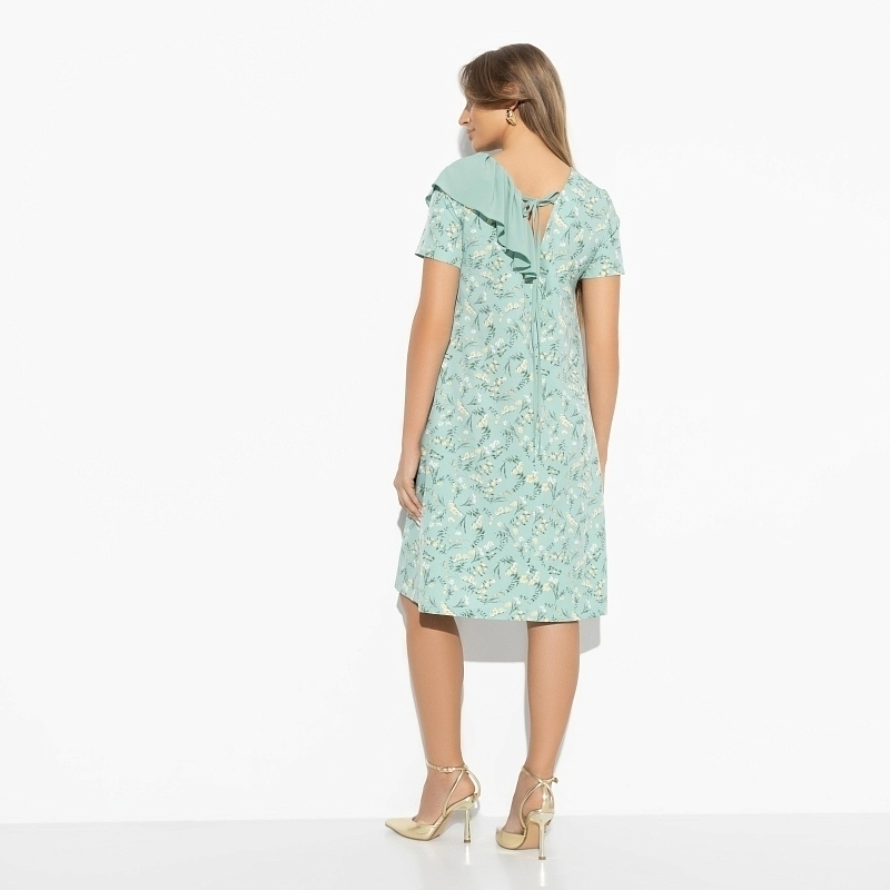 ТН ВЭД: 6204430000; Состав: «Ниагара», «софт» (65% п/э, 30% вискоза, 5% эластан); Плотность ткани: Средняя; Тип ткани: Текстиль; Вид застежки: Завязки; Дополнительный цвет ткани: Желтый; Карманы: Нет; Основной цвет ткани: Зелёный; Отрезная талия: Нет; Подклад: Нет; Резинка по талии: Нет; Рисунок/раппорт: Каждое изделие уникально из-за расположения рисунка на ткани; Сезон: Круглогодичный