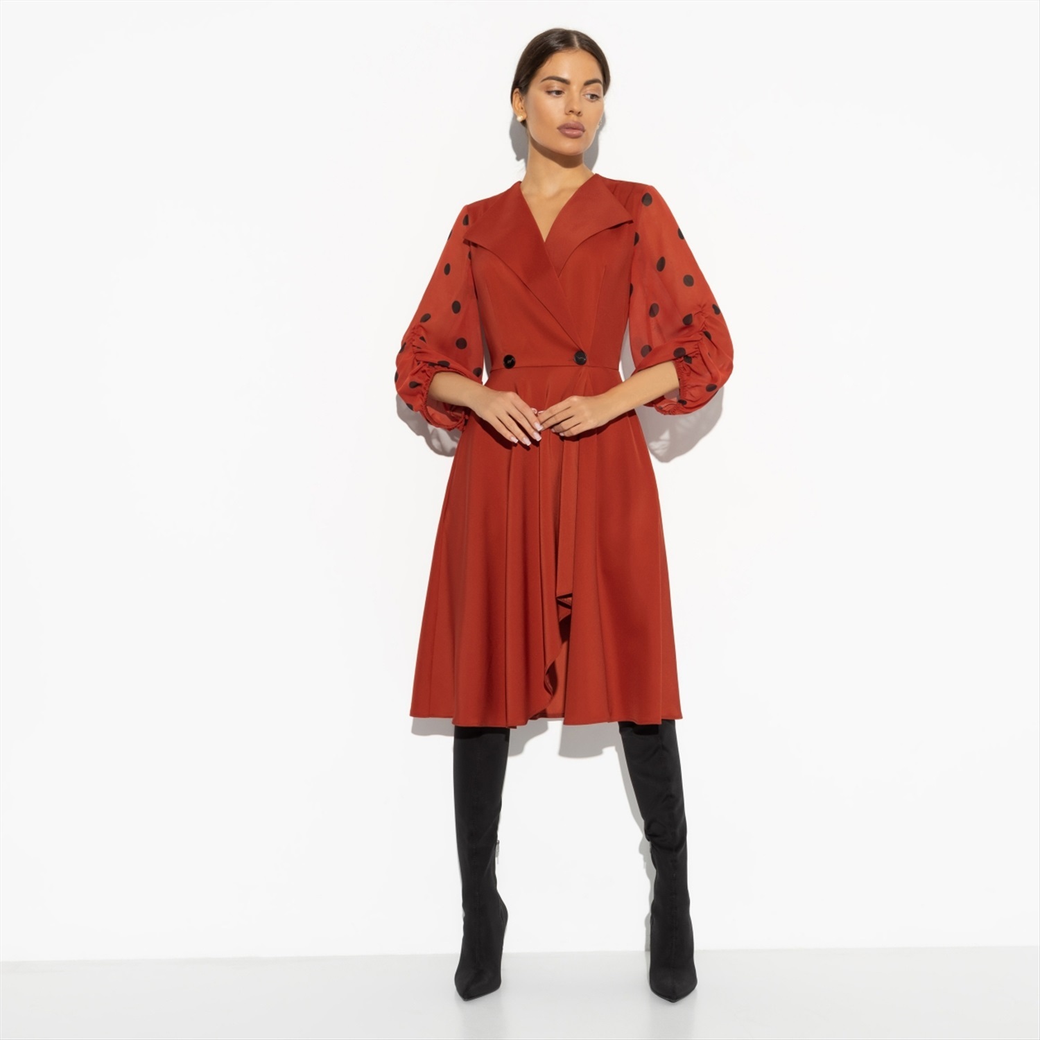 Яркое воспоминание из детства – как мама собирается на работу. Быстрые шаги по дому, мелькание платья и шлейф духов, который оставался после её ухода. Мы точно помним её образ. Наши дети сейчас так же запоминают нас. Будем яркими! Платье ассиметричного кроя на запах. Приталенный силуэт. Сборка на рукавах.