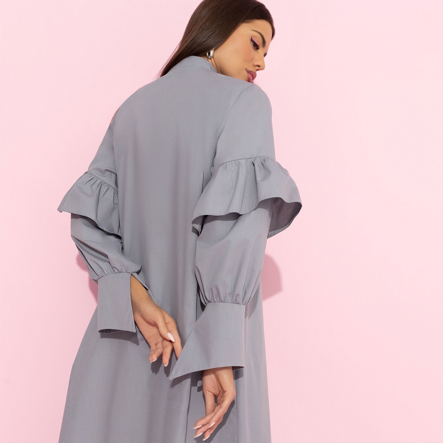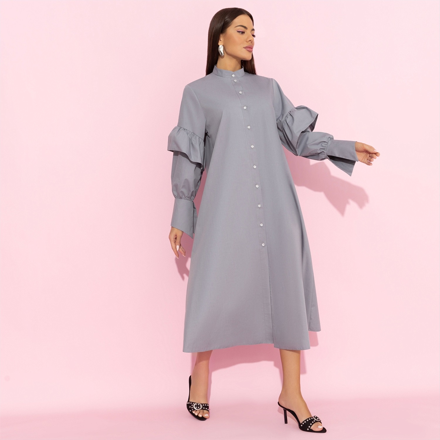 ТН ВЭД: 6204499000; Состав: «Рубашечная ткань» (65% хлопок, 30% п/э, 5% эластан); Плотность ткани: Тонкая; Тип ткани: Текстиль; Вид застежки: Пуговица/-ы; Декоративные элементы: Рюши; Карманы: Нет; Основной цвет ткани: Серый; Отрезная талия: Нет; Подклад: Нет; Резинка по талии: Нет; Рисунок/раппорт: Нет, все изделия идентичны; Сезон: Лето; Силуэт: Свободный; Стиль: Нарядный