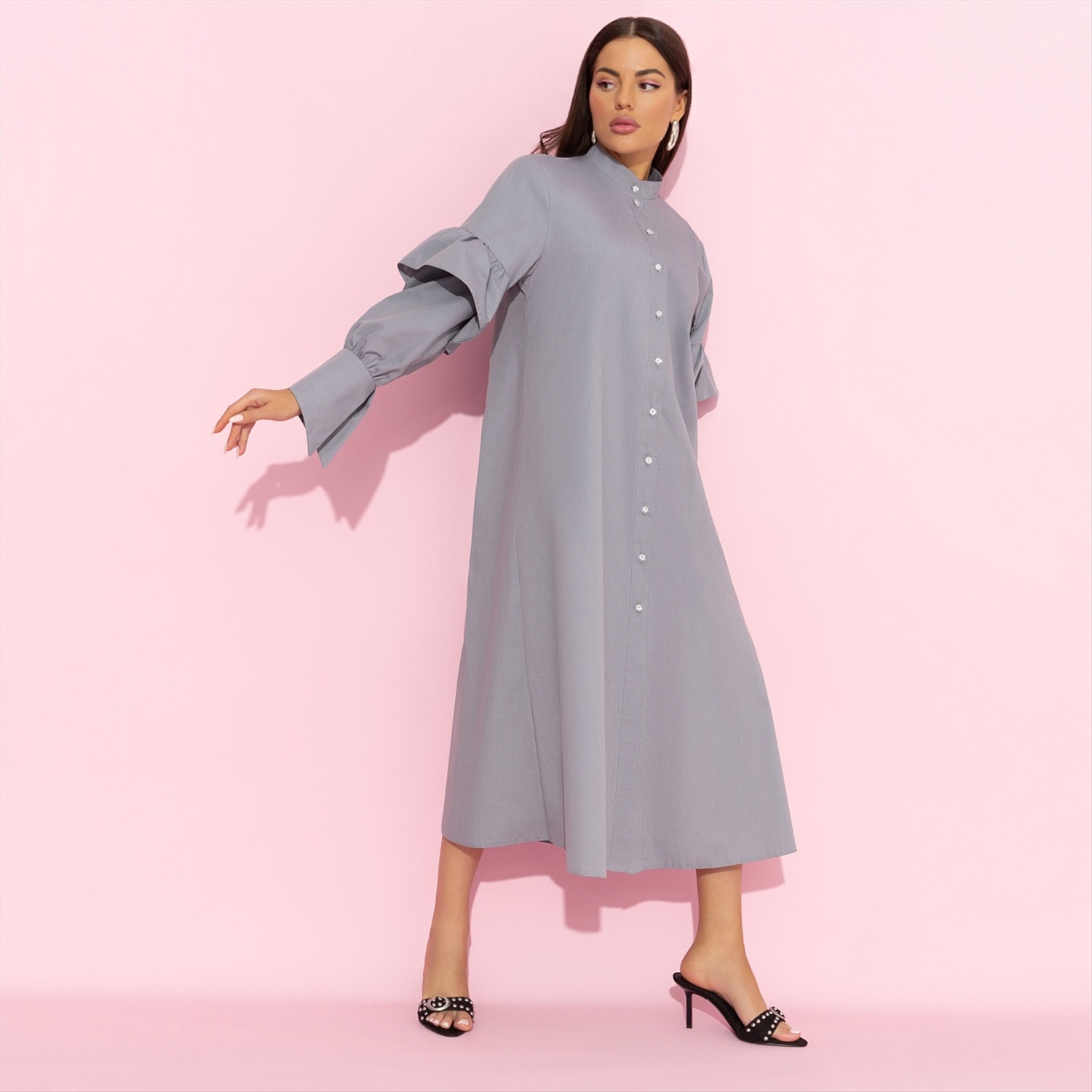 Есть легенда, что Софи Лорен, приходя со съемок домой, обожала нарядиться в платье-рубашку. Любимый предмет гардероба итальянской дивы стал символом тихой роскоши. Платье CHARUTTI уже отправлено прямиком в Италию. Есть несколько свободных экземпляров. Платье свободного кроя в длине миди. Застегивается на пуговицы. Воротник – элегантная стойка. Рукава дополнены рюшами. Широкие манжеты с разрезами.