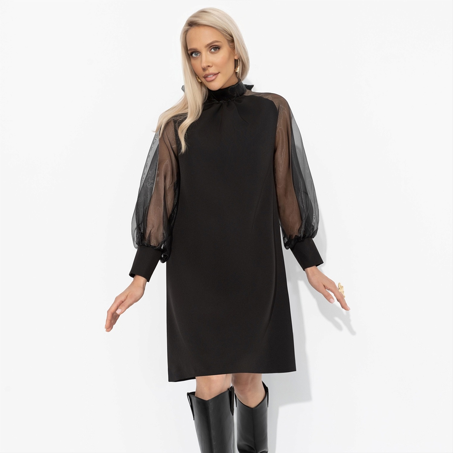 ТН ВЭД: 6104430000; Состав: «Барби», органза (95% п/а, 5% эластан); Плотность ткани: Средняя; Тип ткани: Текстиль; Вид застежки: Завязки; Карманы: Нет; Основной цвет ткани: Черный; Отрезная талия: Нет; Подклад: Нет; Резинка по талии: Нет; Рисунок/раппорт: Нет, все изделия идентичны; Сезон: Круглогодичный; Силуэт: Свободный