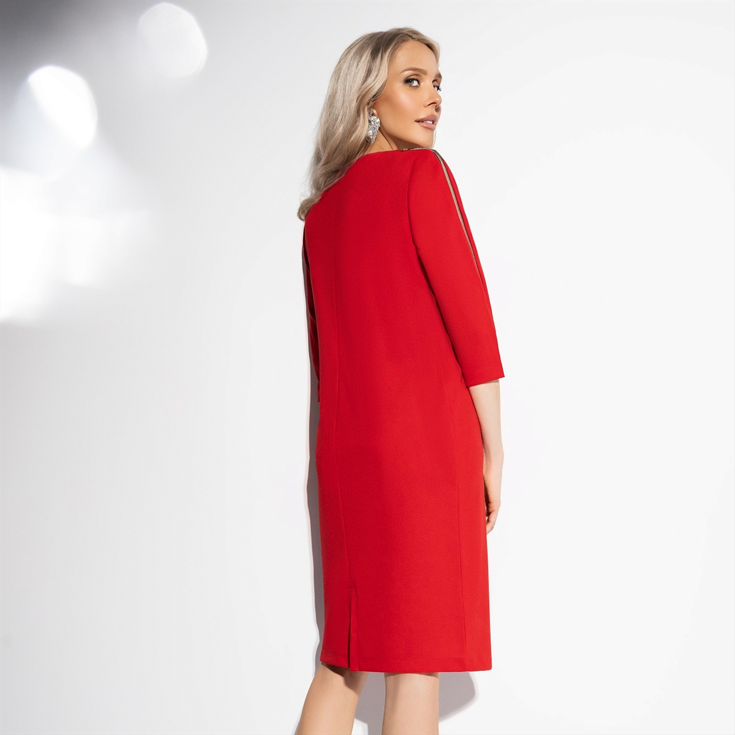ТН ВЭД: 6204430000; Состав: Трикотаж «скуба» (95% п/э, 5% эластан); Плотность ткани: Средняя; Тип ткани: Трикотаж; Вид застежки: Молния; Карманы: Нет; Основной цвет ткани: Красный; Отрезная талия: Нет; Подклад: Нет; Резинка по талии: Нет; Рисунок/раппорт: Нет, все изделия идентичны; Сезон: Круглогодичный; Силуэт: Прямой