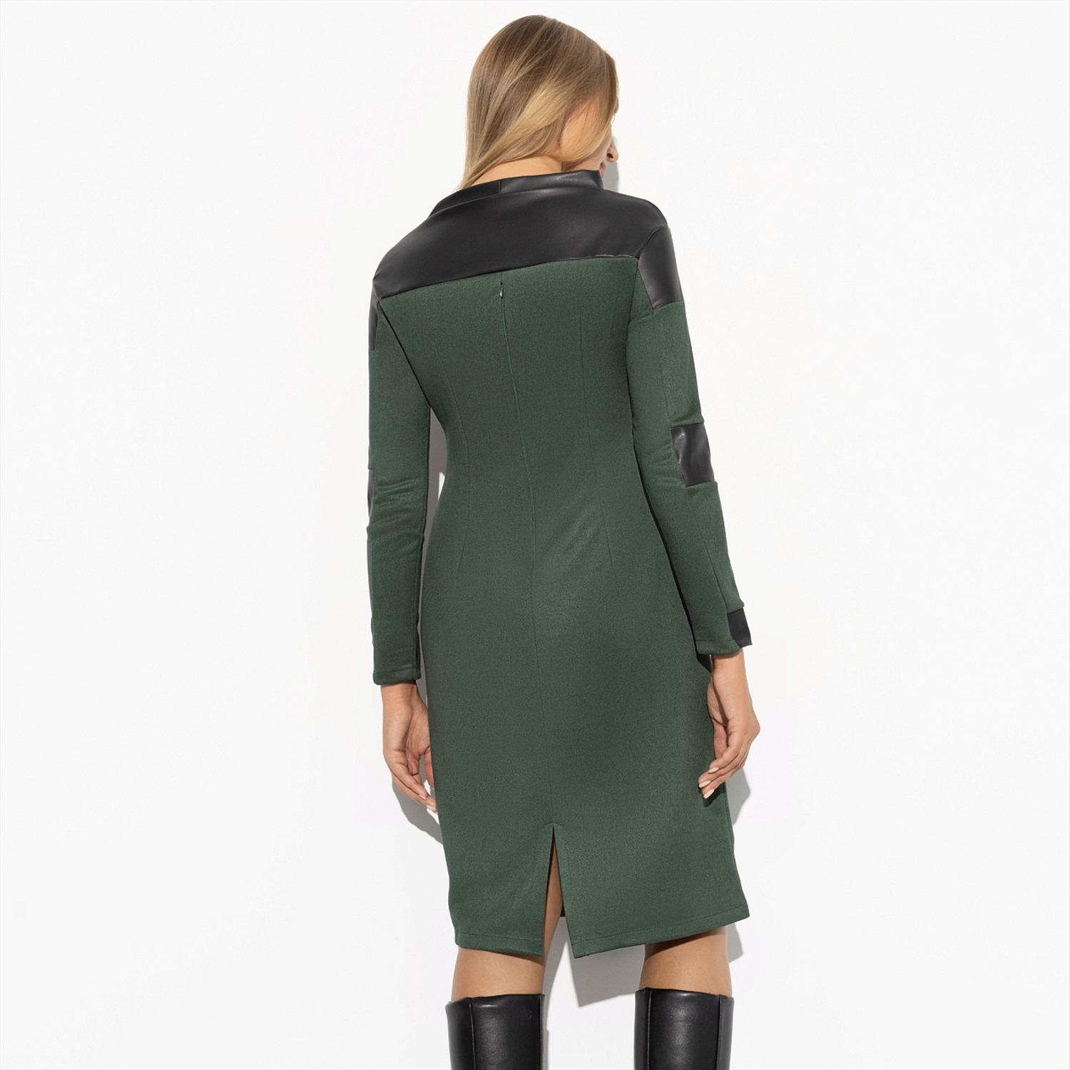 ТН ВЭД: 6104430000; Состав: Трикотаж «экозамша на скубе», «экокожа» (95% п/э, 5% спандекс); Плотность ткани: Плотная; Тип ткани: Трикотаж, текстиль; Вид застежки: Молния; Дополнительный цвет ткани: Черный; Карманы: Нет; Основной цвет ткани: Зелёный; Отрезная талия: Нет; Подклад: Нет; Резинка по талии: Нет; Рисунок/раппорт: Нет, все изделия идентичны; Сезон: Зима