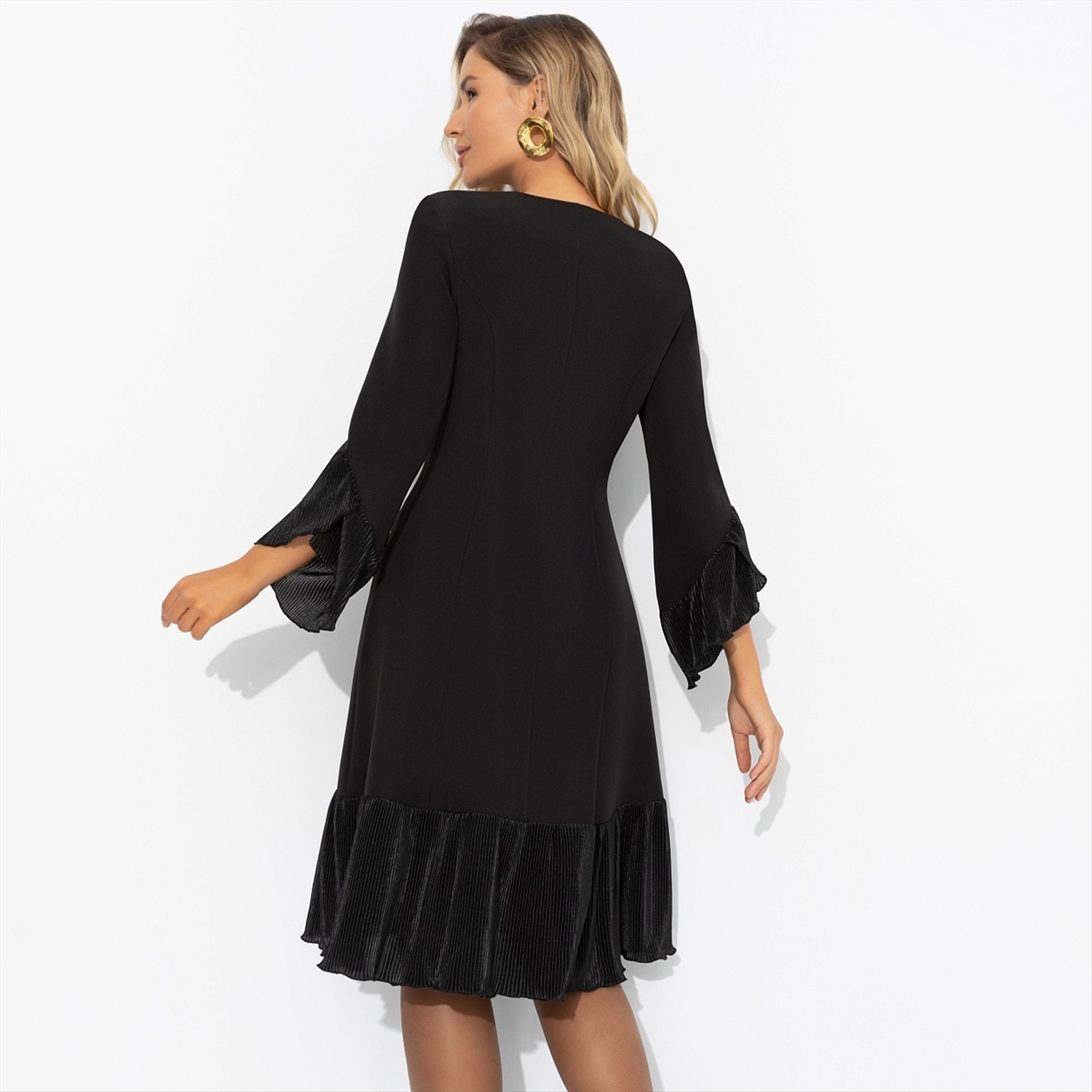 Платье ЧАРУТТИ как воплощение вашего уверенного и вдохновляющего стиля руководства. Безупречный силуэт подчеркивает собранность и целеустремленность, а струящиеся рюши говорят о мягкости и внимании к деталям. Идеальный баланс между элегантностью и современным подходом, который вы привносите в команду. Платье приталенного силуэта в длине миди. Подол изделия и рукава оформлены рюшами из акцентной ткани-гофре. Платье застегивается на пуговицы. Есть карманы.