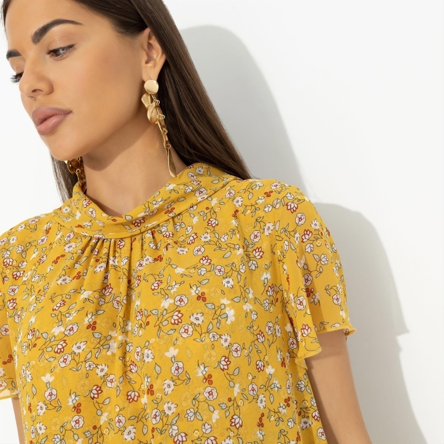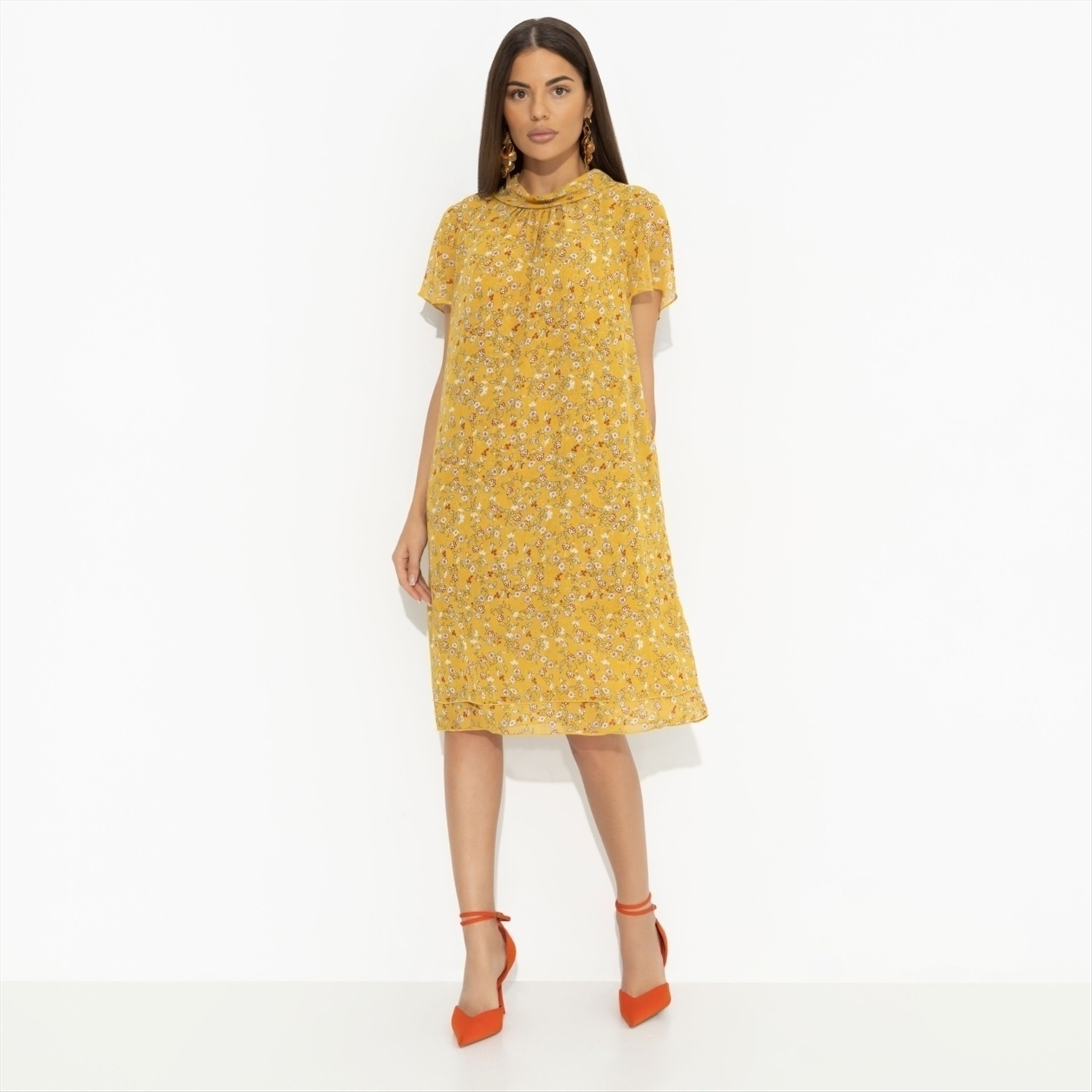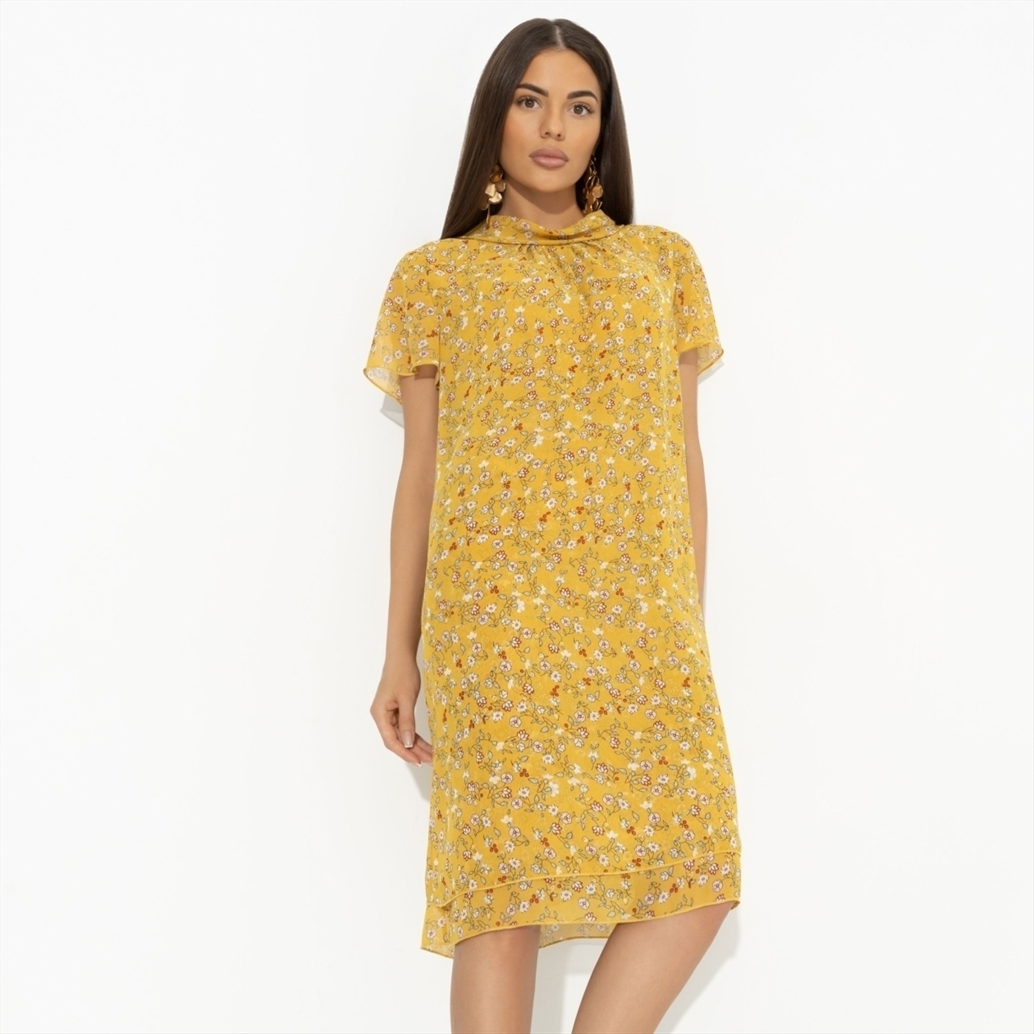 ТН ВЭД: 6204430000; Состав: Плательная ткань «шифон» (100% полиэстер); Плотность ткани: Тонкая; Тип ткани: Текстиль; Вид застежки: Завязки; Декоративные элементы: Драпировка; Дополнительный цвет ткани: Разноцветный; Карманы: Нет; Основной цвет ткани: Жёлтый; Отрезная талия: Нет; Подклад: Есть; Резинка по талии: Нет; Рисунок/раппорт: Нет, все изделия идентичны; Сезон: Лето; Силуэт: Свободный; Стиль: Повседневный