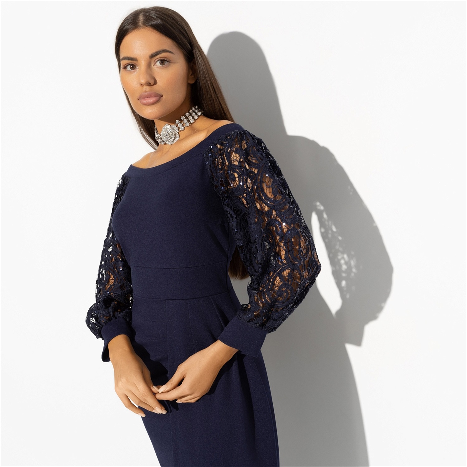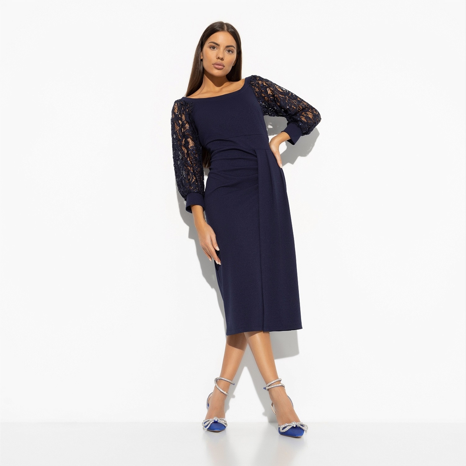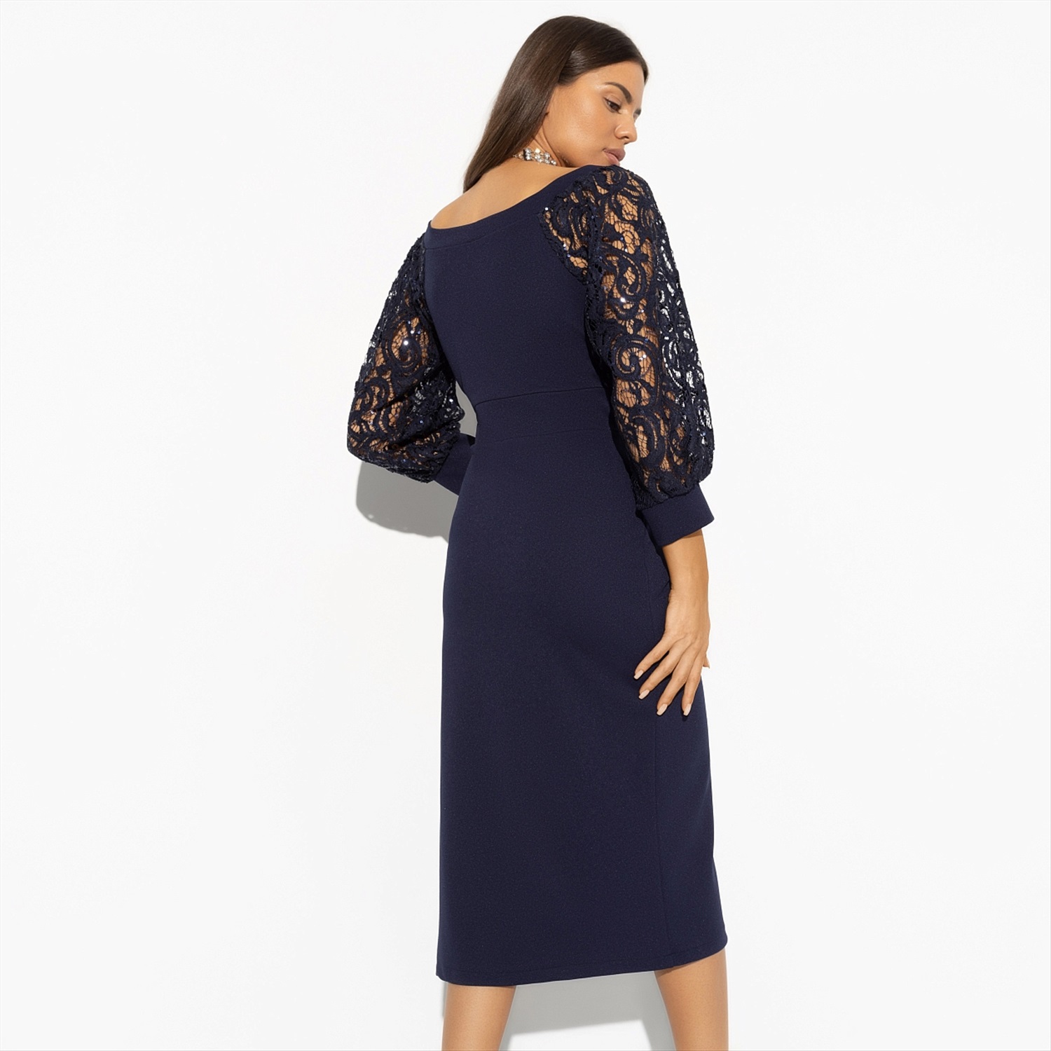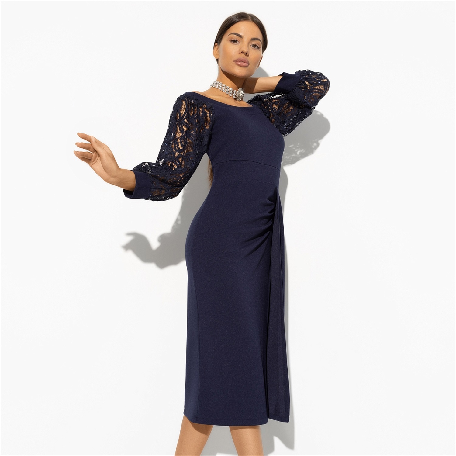 ТН ВЭД: 6104430000; Состав: Трикотаж «скуба», кружево (95% п/а, 5% эластан); Плотность ткани: Плотная; Тип ткани: Трикотаж; Вид застежки: Нет; Карманы: Нет; Основной цвет ткани: Синий; Отрезная талия: Есть; Подклад: Нет; Резинка по талии: Нет; Рисунок/раппорт: Нет, все изделия идентичны; Сезон: Круглогодичный