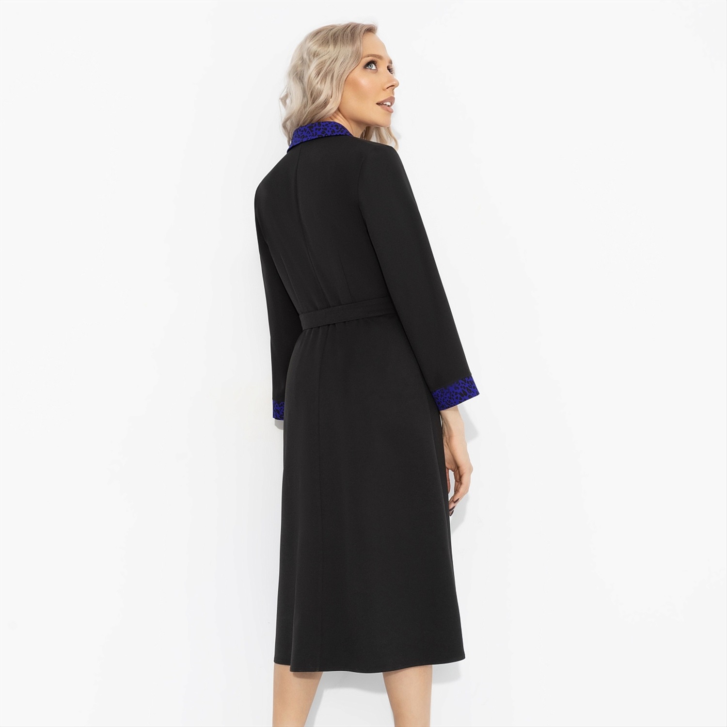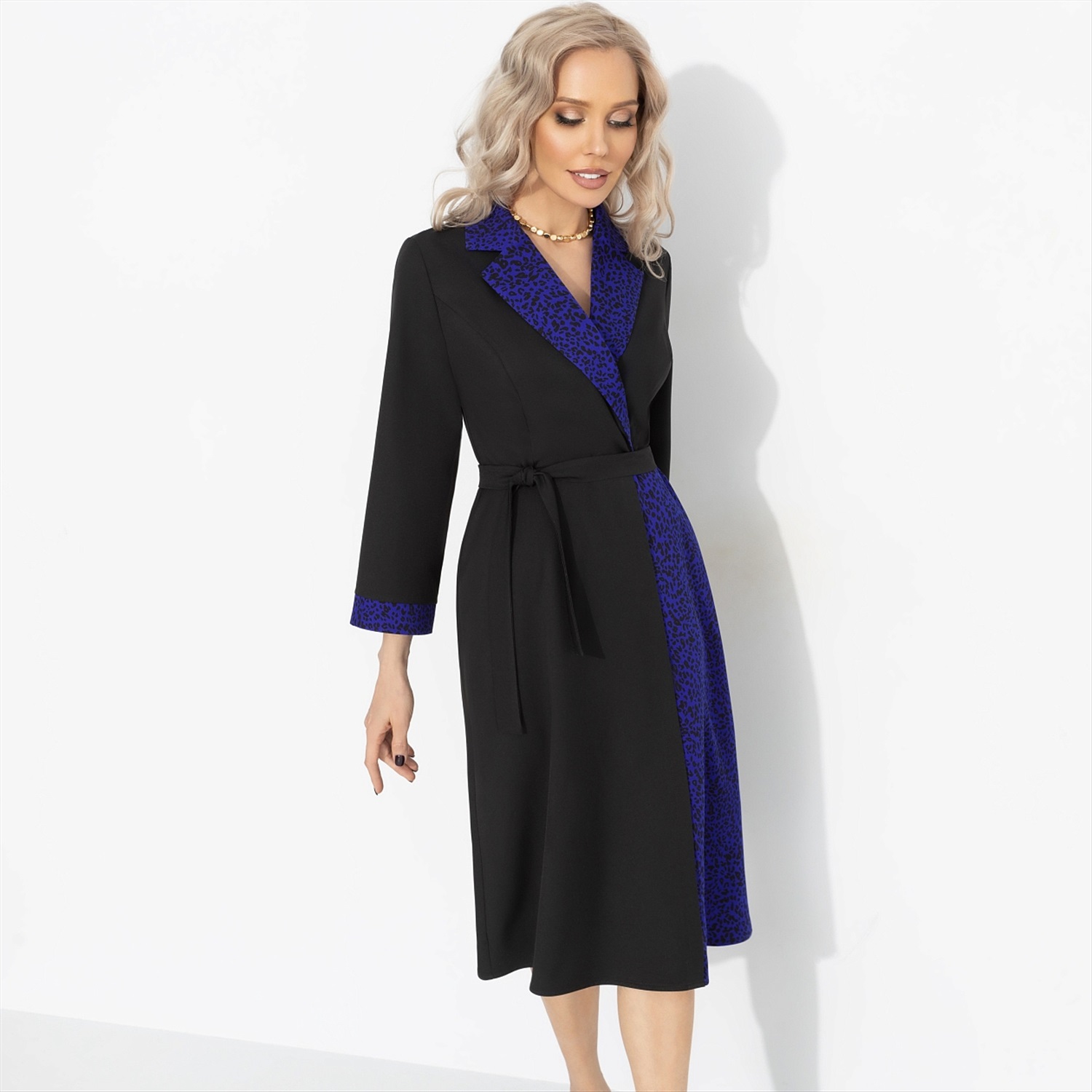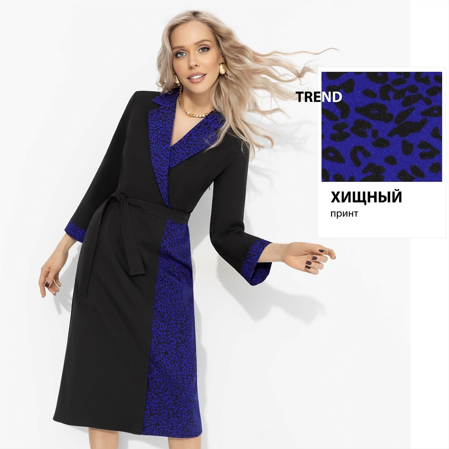 Модная полиция объявляет розыск «стильной мафии» – женщин, которые не соглашаются на скучные платья. Контрастный синий леопард по борту и линии талии работает, как личная охрана: подчеркивает силу и дерзость. Единственный риск – пожизненный приговор к восхищенным взглядам. Платье миди эффектного кроя с поясом подчеркивает талию и визуально стройнит. Имитация запаха. Рукав 3/4 и длина ниже колена делают модель универсальной для офиса, свидания и вечерних выходов.