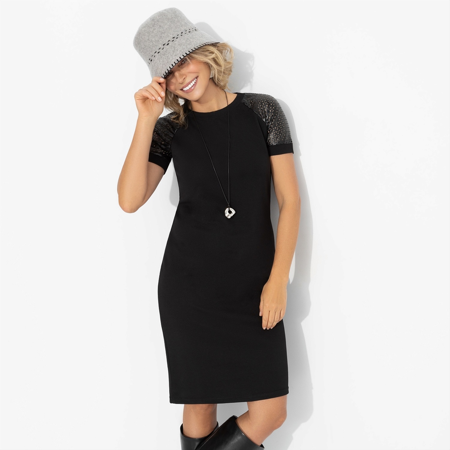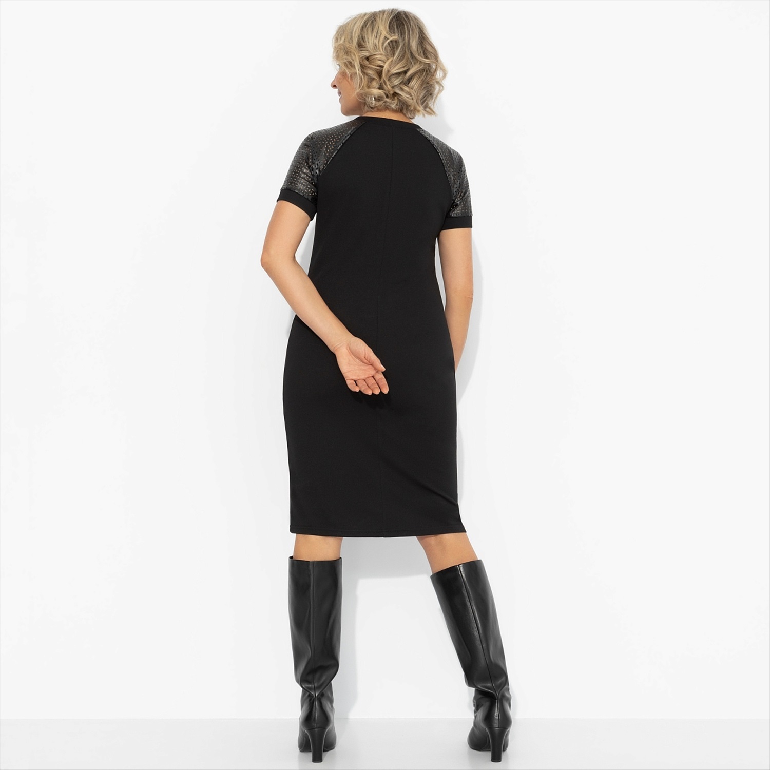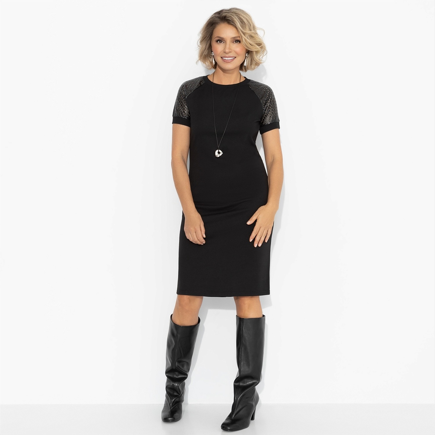 То самое маленькое чёрное? Только с твоим дерзким характером! В этом платье легко быть загадкой вечера. Весь город – твой подиум. Платье-футляр длины миди, с эффектными короткими рукавами, декорированными вставками под кожу. Эластичная и приятная ткань подчёркивает фигуру, не сковывает движения. Вариант на каждый случай, когда хочется уверенности и комплиментов.