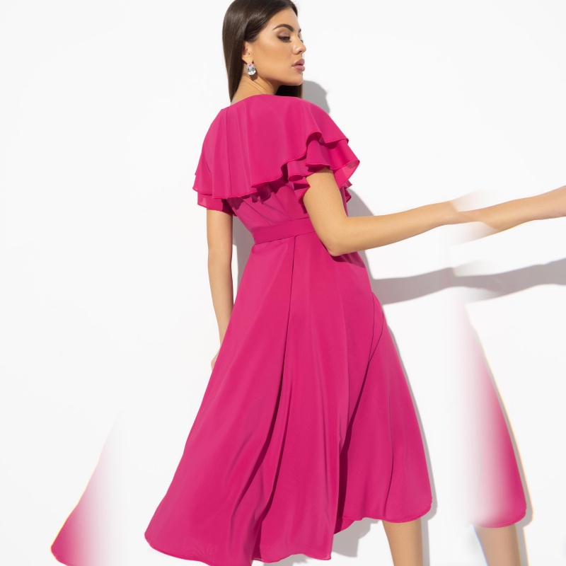 ТН ВЭД: 6204430000; Состав: «Креп-шифон» (100% п/э); Плотность ткани: Тонкая; Тип ткани: Текстиль; Вид застежки: Пояс; Карманы: Нет; Основной цвет ткани: Фуксия; Отрезная талия: Есть; Подклад: Есть; Резинка по талии: Есть; Рисунок/раппорт: Нет, все изделия идентичны; Сезон: Круглогодичный