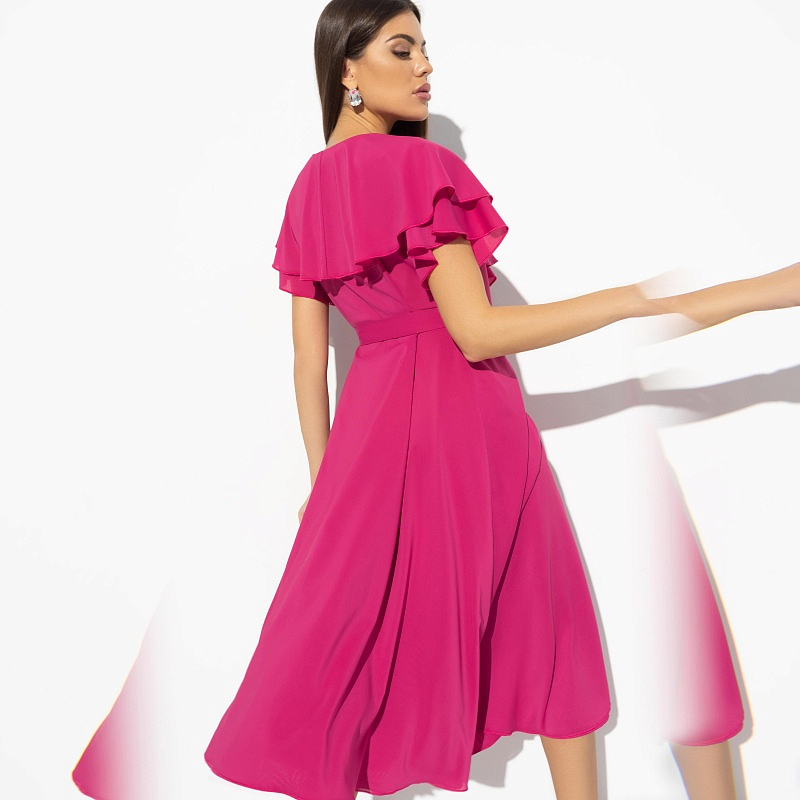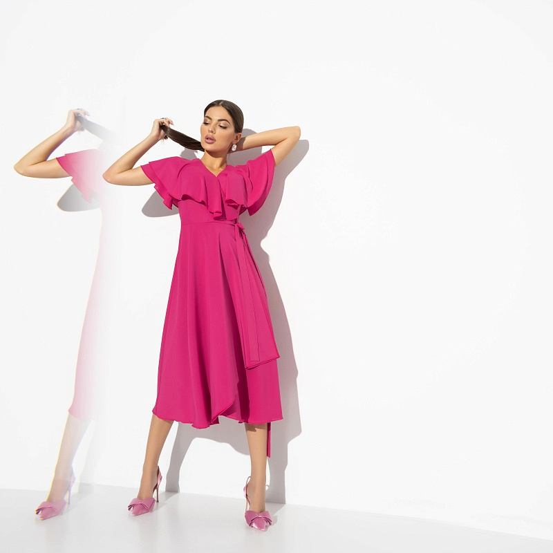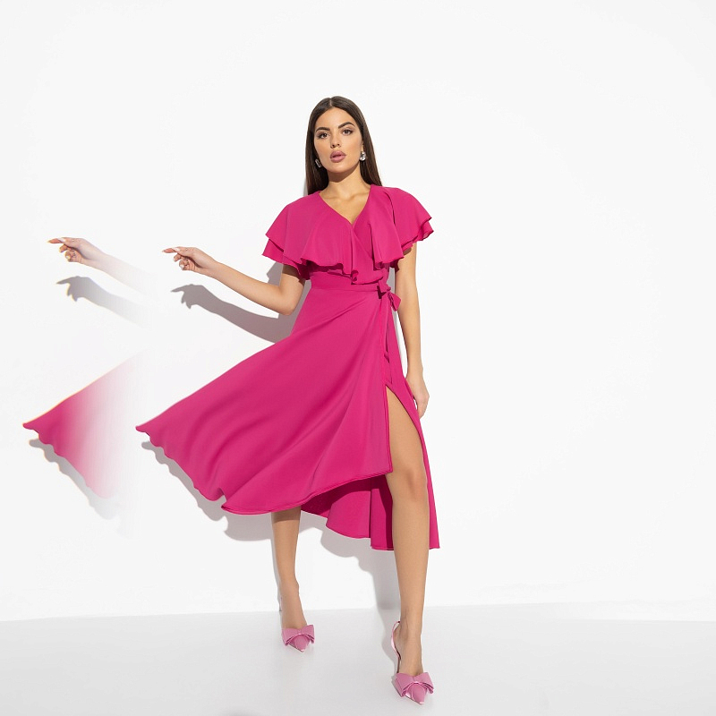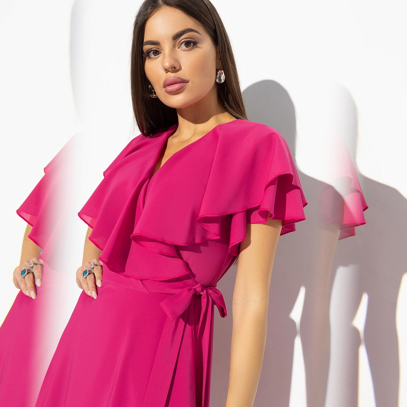 ТН ВЭД: 6204430000; Состав: «Креп-шифон» (100% п/э); Плотность ткани: Тонкая; Тип ткани: Текстиль; Вид застежки: Пояс; Карманы: Нет; Основной цвет ткани: Фуксия; Отрезная талия: Есть; Подклад: Есть; Рисунок/раппорт: Нет, все изделия идентичны; Сезон: Круглогодичный