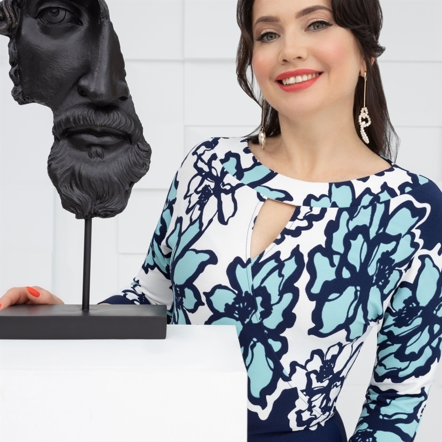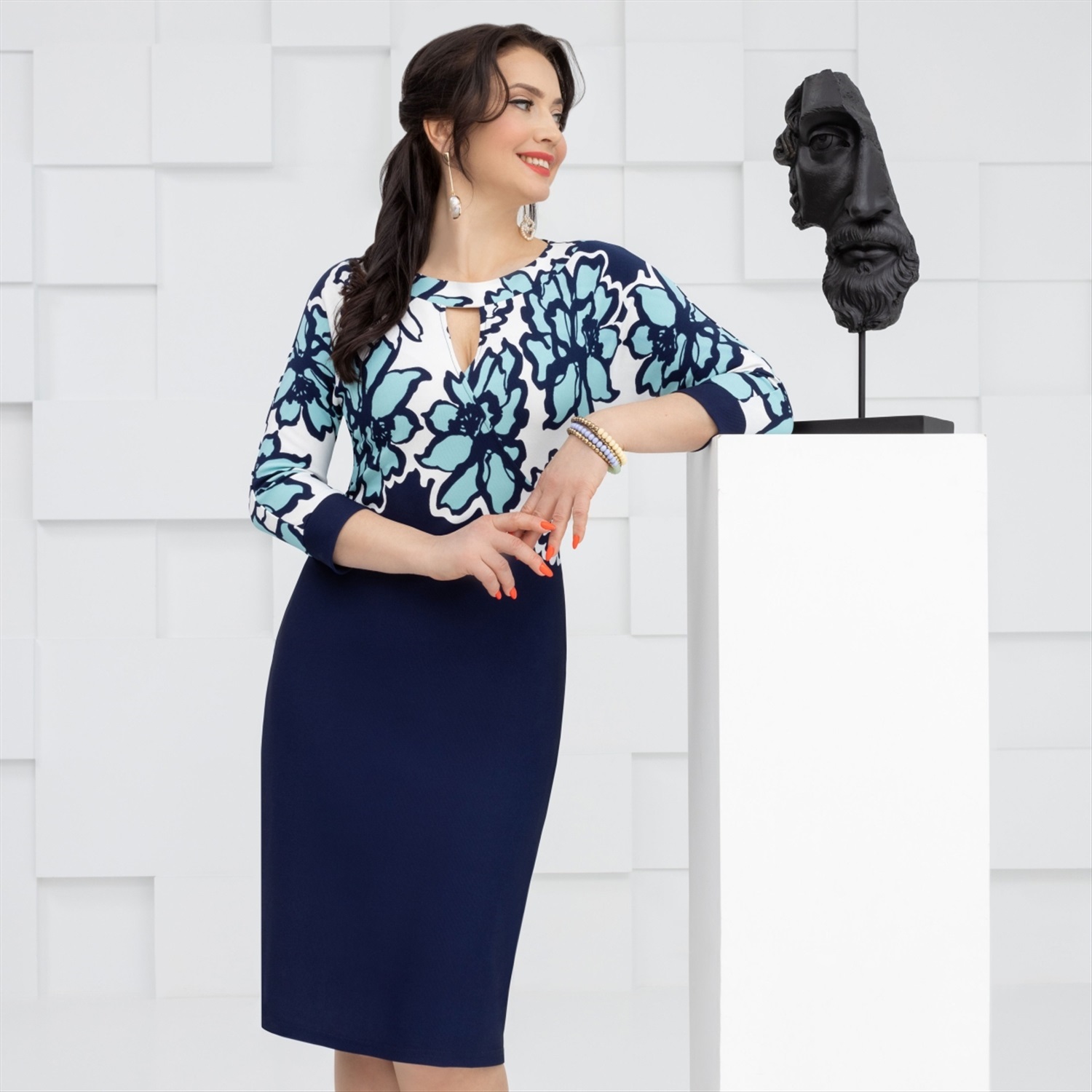 ТН ВЭД: 6104430000; Состав: Трикотаж «оттоман» (95% п/э, 5% спандекс); Тип ткани: Трикотаж; Дополнительный цвет ткани: Разноцветный; Основной цвет ткани: Синий; Отрезная талия: Есть; Подклад: Есть; Резинка по талии: Есть; Сезон: Демисезон