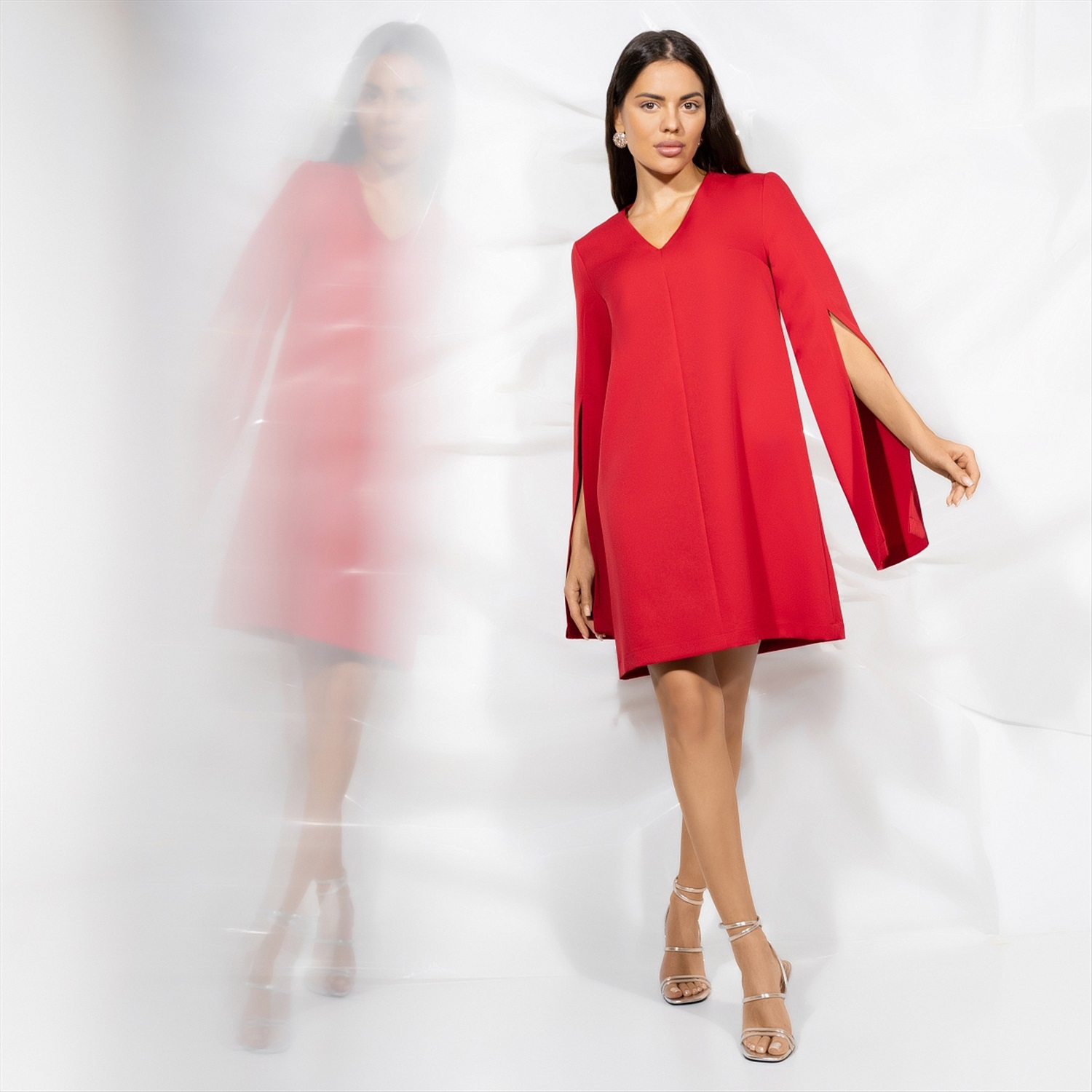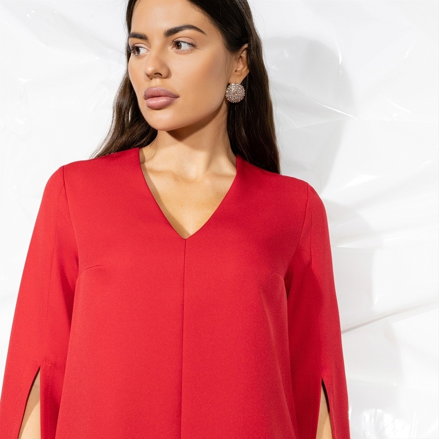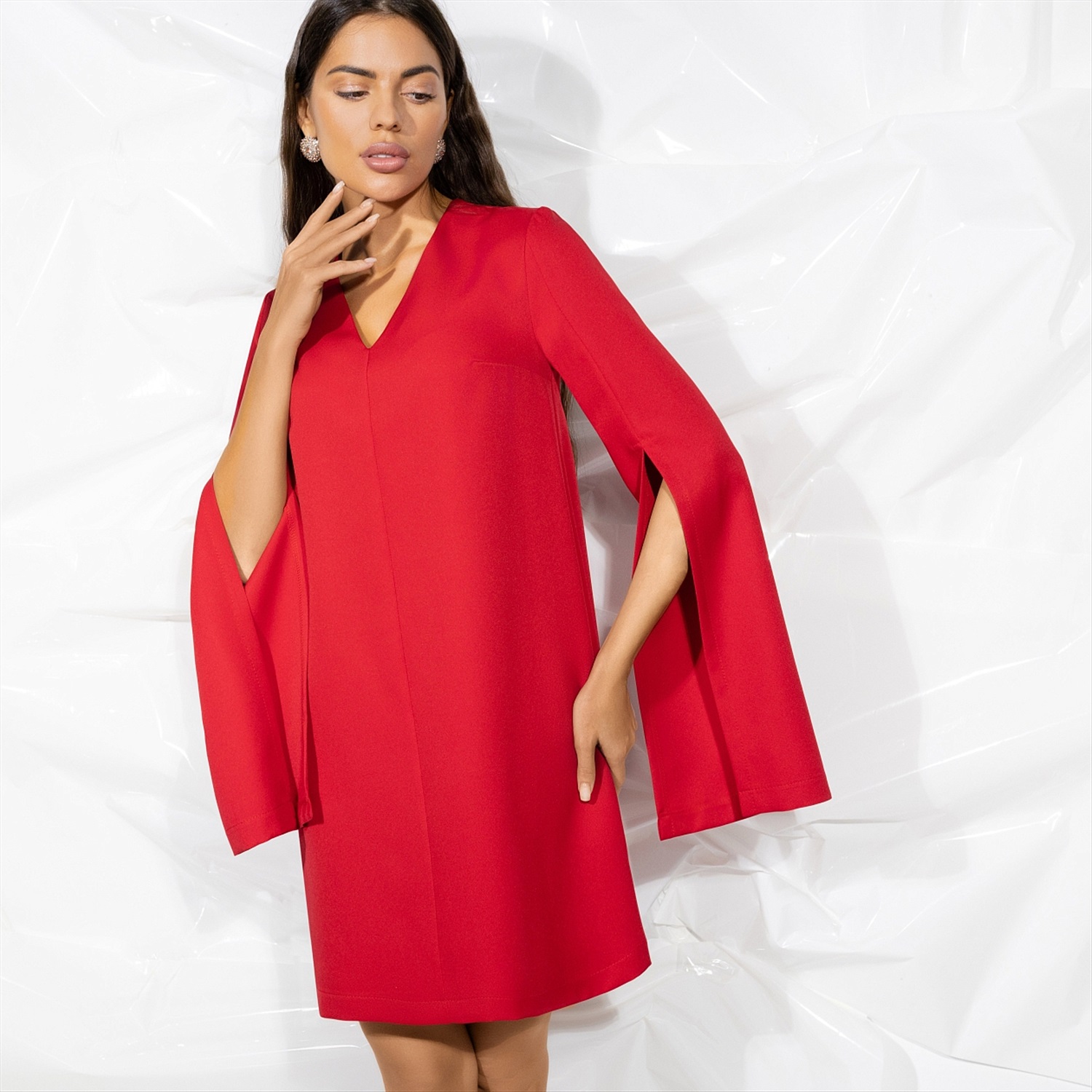 Дженифер Лоуренс, Ким Кардашьян, Ирина Шейк и Сальма Хайек выбирают для торжественных случаев платья красного цвета. Станьте и вы звездой в платье CHARUTTI. Ваша красная дорожка еще впереди. Платье в длине мини. Трапецевидный силуэт. Удлиненный свободный рукав, разрез на три четверти рукава. Без подклада.