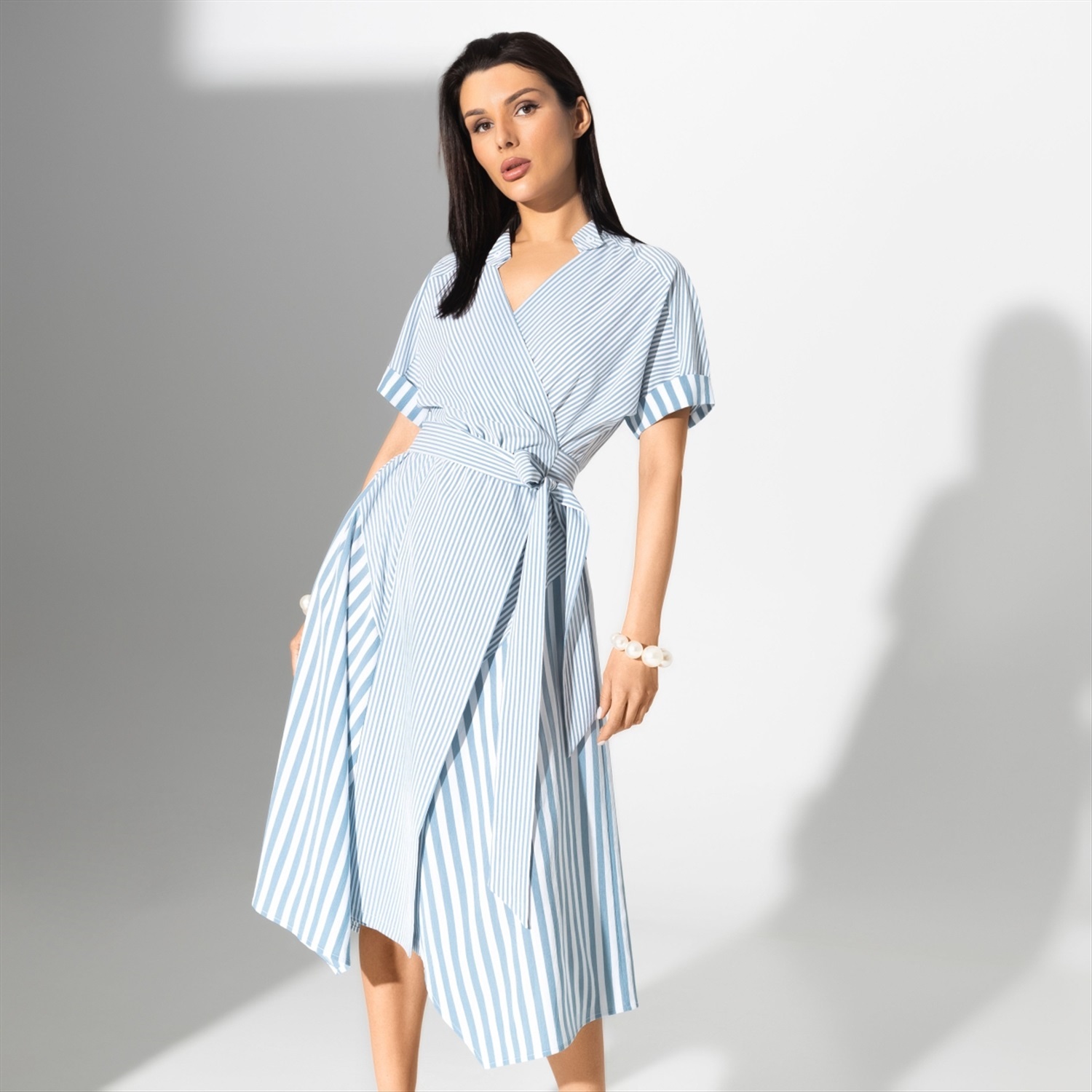 ТН ВЭД: 6204430000; Состав: Рубашечная ткань «поливискоза» (65% п/э, 30% вискоза, 5% спандекс); Плотность ткани: Средняя; Тип ткани: Текстиль; Вид застежки: Пояс; Дополнительный цвет ткани: Белый; Карманы: В боковом шве; Основной цвет ткани: Голубой; Отрезная талия: Есть; Подклад: Нет; Резинка по талии: Есть; Рисунок/раппорт: Каждое изделие уникально из-за расположения рисунка на ткани; Сезон: Лето