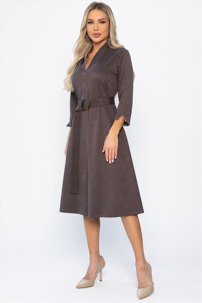 Элегантное платье полуприлегающего силуэта станет идеальным выбором для создания женственного образа! Спереди расположен интригующий разрез, придающий модели особый шарм. Уникальной особенностью этого платья являются декоративные элементы из ткани-компаньона на воротнике-стойке и манжетах рукавов. Втачные рукава длиной три четверти заканчиваются разрезом и украшены манжетами из ткани-компаньона. Воротник-стойка с обтачкой контрастного цвета плавно переходит в разрез у линии груди и продолжается рядом пуговиц до линии талии. В комплект входит пояс с пряжкой.