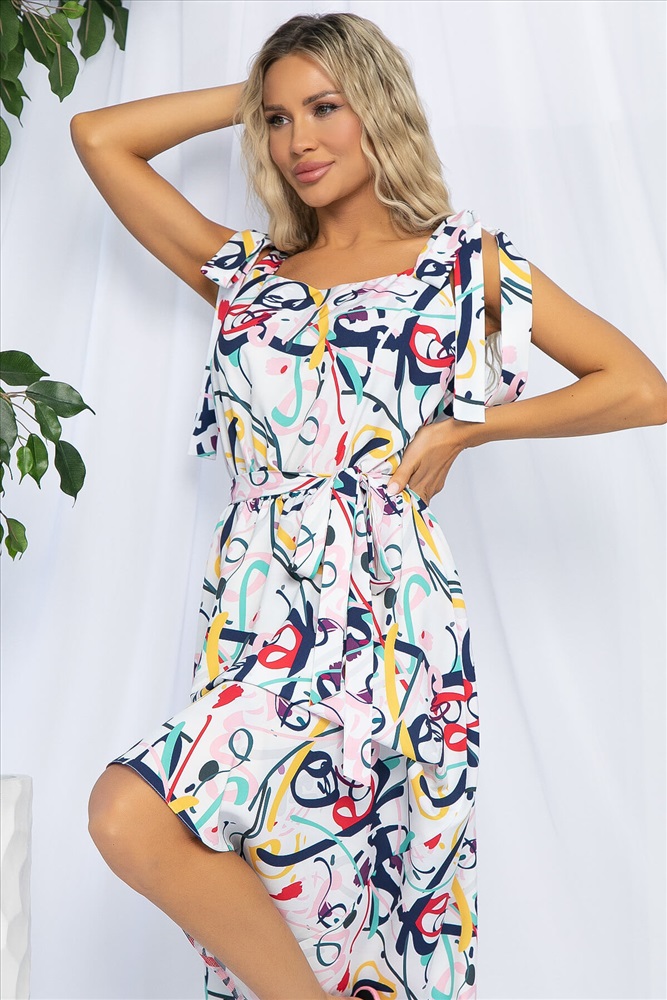 Летнее женское платье, выполненное в белом цвете и украшенное ярким принтом, — это не только модное, но и стильное решение, которое должно быть в гардеробе каждой модницы. Платье полуприлегающего силуэта с бантами на плечах придаёт образу лёгкость и кокетливость. Оно идеально подходит для прогулок по городу, романтических пикников на природе и посещения различных мероприятий. Подчеркнуть талию можно с помощью пояса из основной ткани, который входит в комплект. Благодаря этому дополнению образ становится более завершённым и элегантным. Создав такой образ, вы будете выглядеть стильно и чувствовать себя комфортно в жаркие летние дни. По талии на резинке.