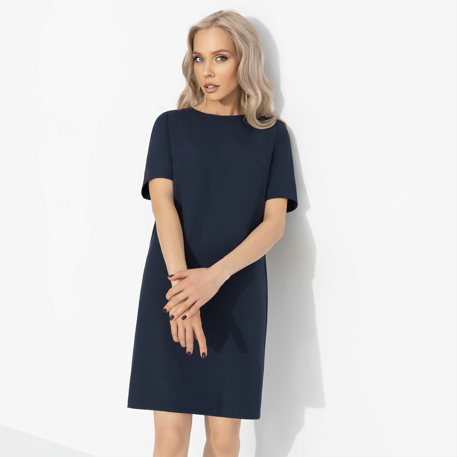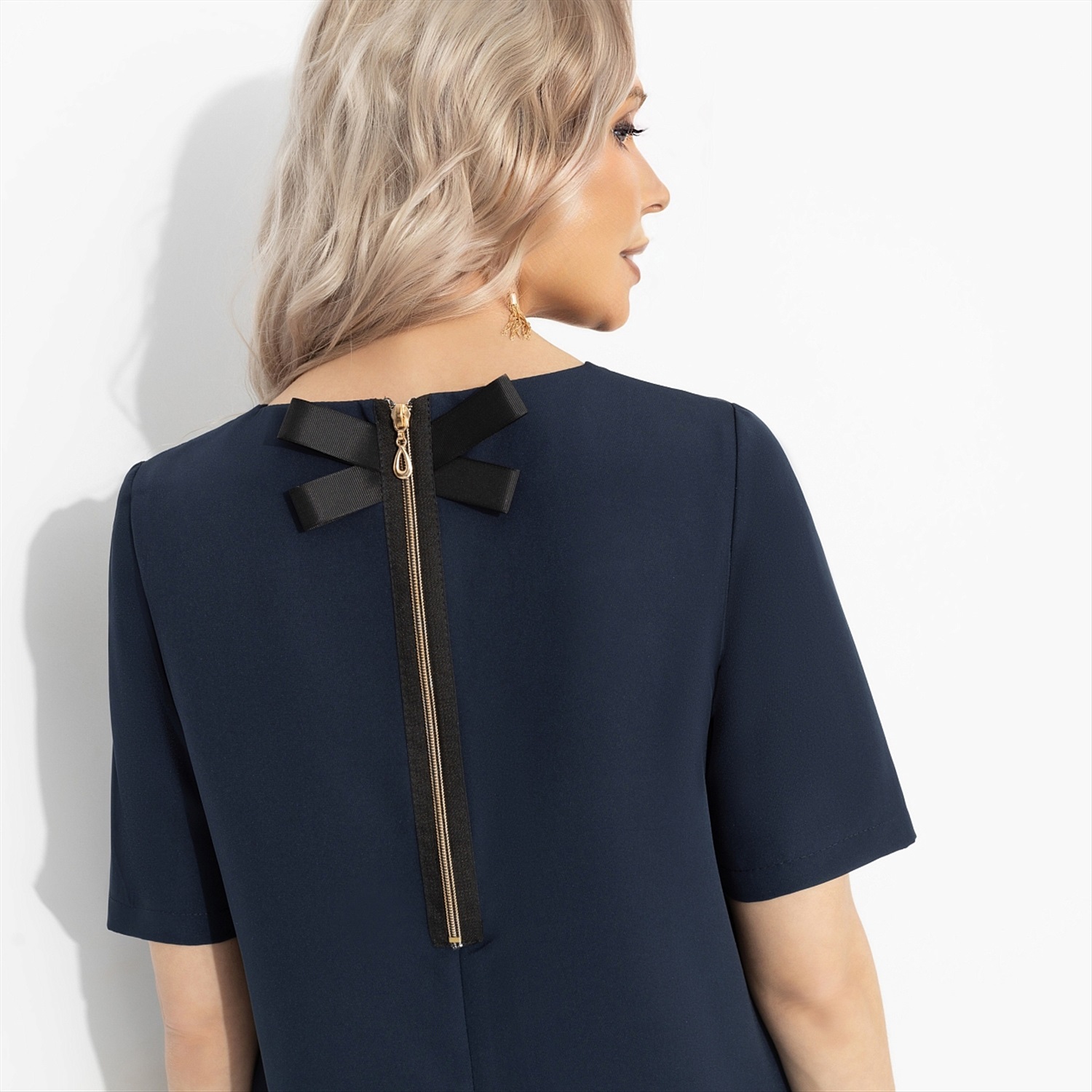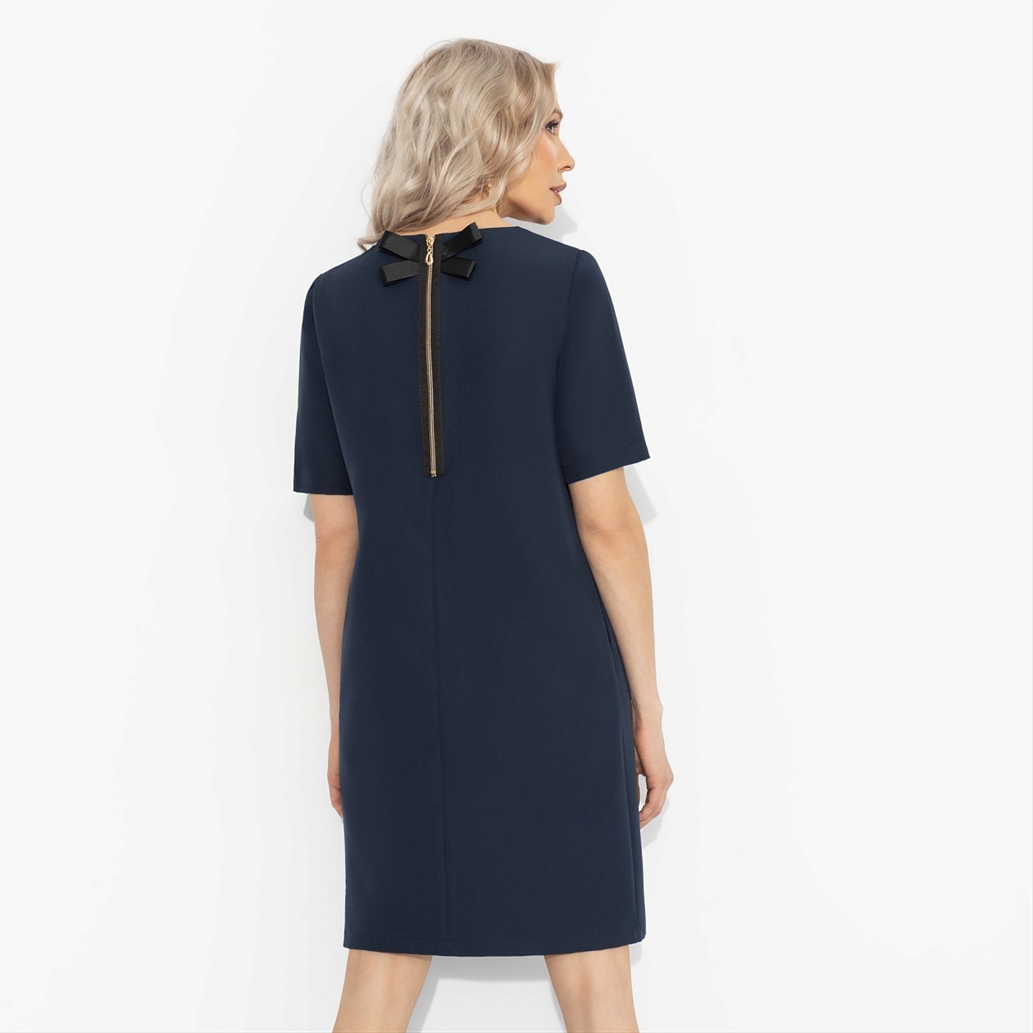 ТН ВЭД: 6204430000; Состав: «Барби» (95% п/э, 5% эластан); Плотность ткани: Средняя; Тип ткани: Текстиль; Вид застежки: Молния; Декоративные элементы: Банты; Карманы: В боковом шве; Основной цвет ткани: Синий; Отрезная талия: Нет; Подклад: Нет; Резинка по талии: Нет; Рисунок/раппорт: Нет, все изделия идентичны; Сезон: Круглогодичный; Силуэт: Прямой; Стиль: Повседневный