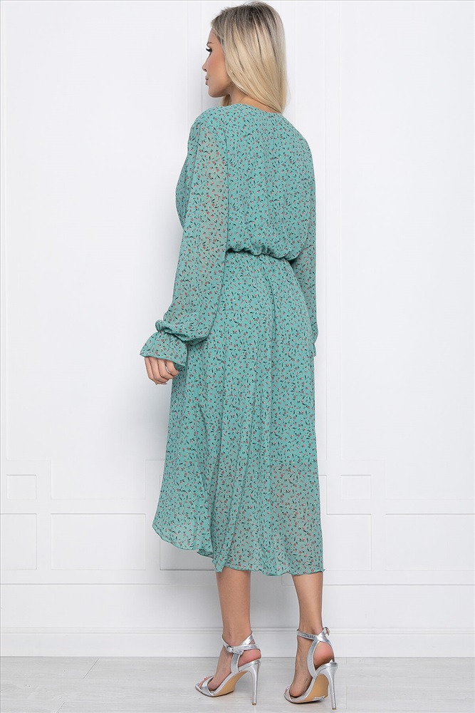 Невероятно стильное платье не оставит вас равнодушным! Оно собрало все элементы женственности. Изделие украшает V-образный вырез с имитацией запаха. Рукав длинный, по низу на резинке с рюшей. В комплект входит пояс из основной ткани, который отлично подчеркнет линию талии! Юбка платья с запахом. Платье на подкладке.