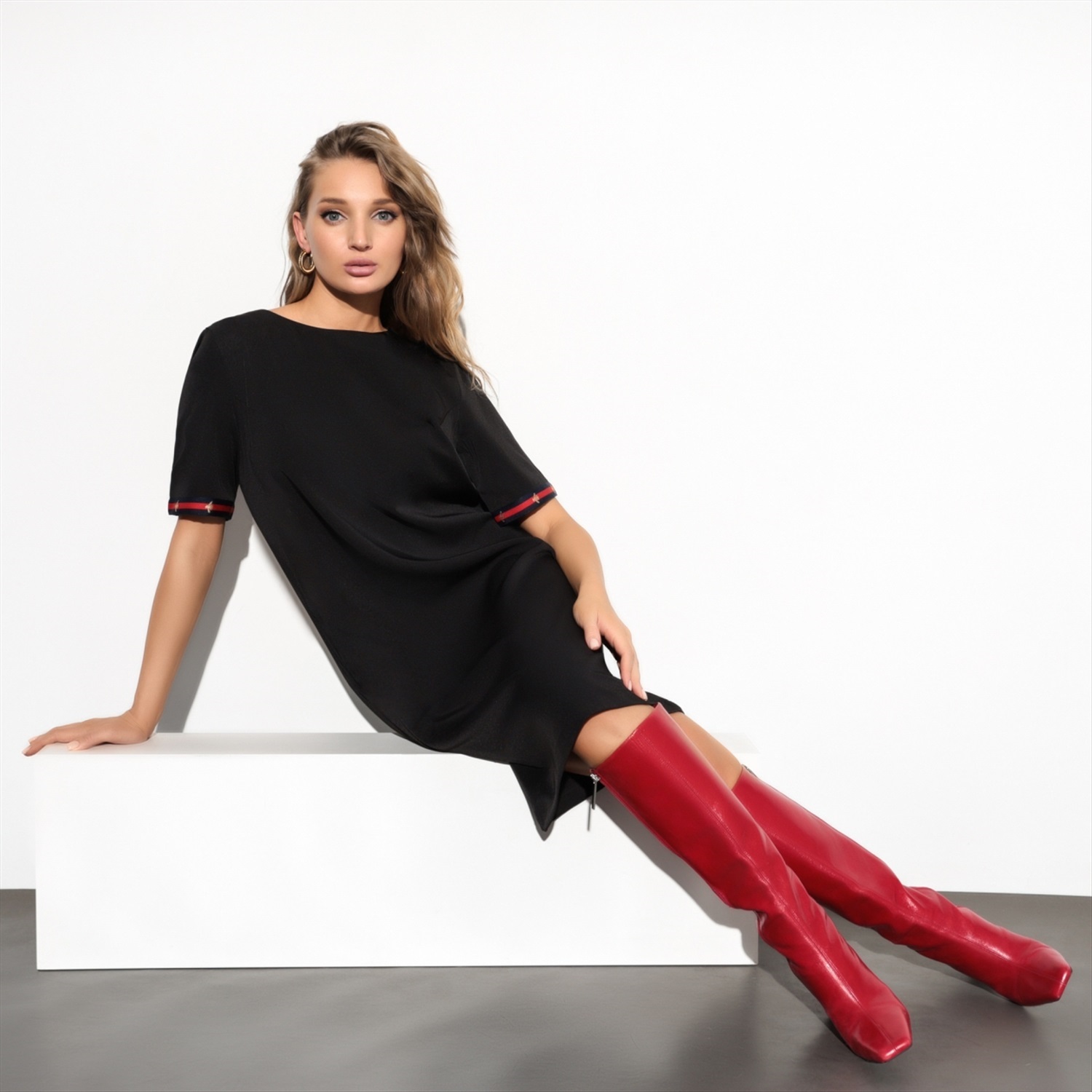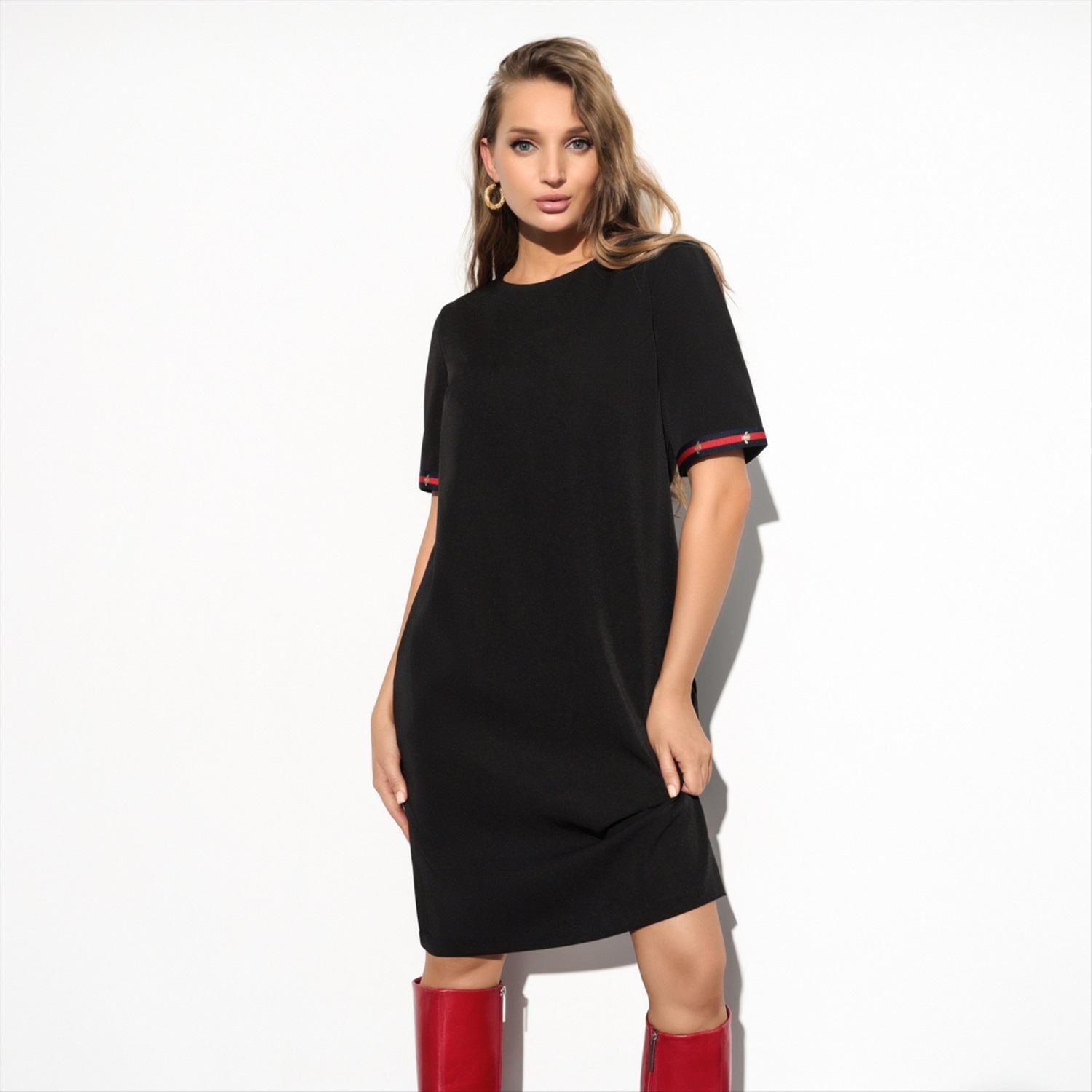 ТН ВЭД: 6204430000; Состав: Костюмная ткань «пикачу» (96% п/э, 4% эластан); Плотность ткани: Средняя; Тип ткани: Текстиль; Вид застежки: Нет; Дополнительный цвет ткани: Красный; Карманы: В боковом шве; Основной цвет ткани: Черный; Отрезная талия: Нет; Подклад: Нет; Резинка по талии: Нет; Рисунок/раппорт: Нет, все изделия идентичны; Сезон: Круглогодичный