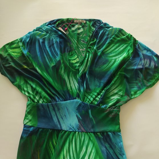 Оптовая продажа. Летнее платье длиной миди, с короткими рукавами свободного силуэта с отрезной приталенной поясной частью, сбоку застёжка на молнию. Яркий зелёный принт "Листья" по всему полотну изделия. Широкий пояс, имитирующий кожу, в комплекте.