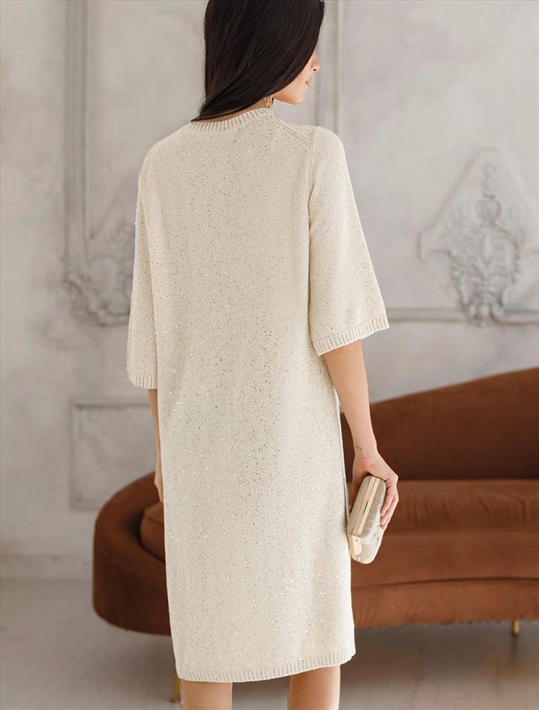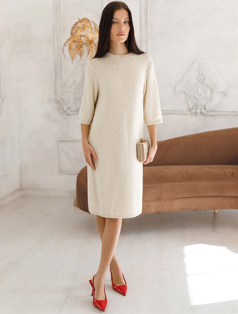 Эффектное платье бежевого цвета с широкими рукавами средней длины выполнено из хлопковой пряжи с вкраплением сияющих пайеток, что придает особую изысканность. Платье связано изнанкой, пряжа отличается легкостью и приятной текстурой, совершенно не колется, обеспечивает комфорт даже при длительном использовании, а натуральные волокна поддерживают оптимальный температурный баланс. Крой полуприлегающий, подчеркивает женственный силуэт, а круглый ворот, манжеты на рукавах и по низу гармонично завершают дизайн, создающий аккуратный образ. Благодаря универсальному крою, платье подойдет девушкам и женщинам пышных форм и больших размеров, длина миди подходит на низкий и высокий рост. Мерцающее полотно добавляет особого шарма вашему образу, делая его уместным как на праздник, так и для повседневного выхода. Новый год, вечеринка или любое другое мероприятие пройдут ярко — сияющие пайетки создают ощущение праздника в каждом движении. Это стильное платье поможет чувствовать себя уверенно на любом мероприятии в осенний и зимний сезон.