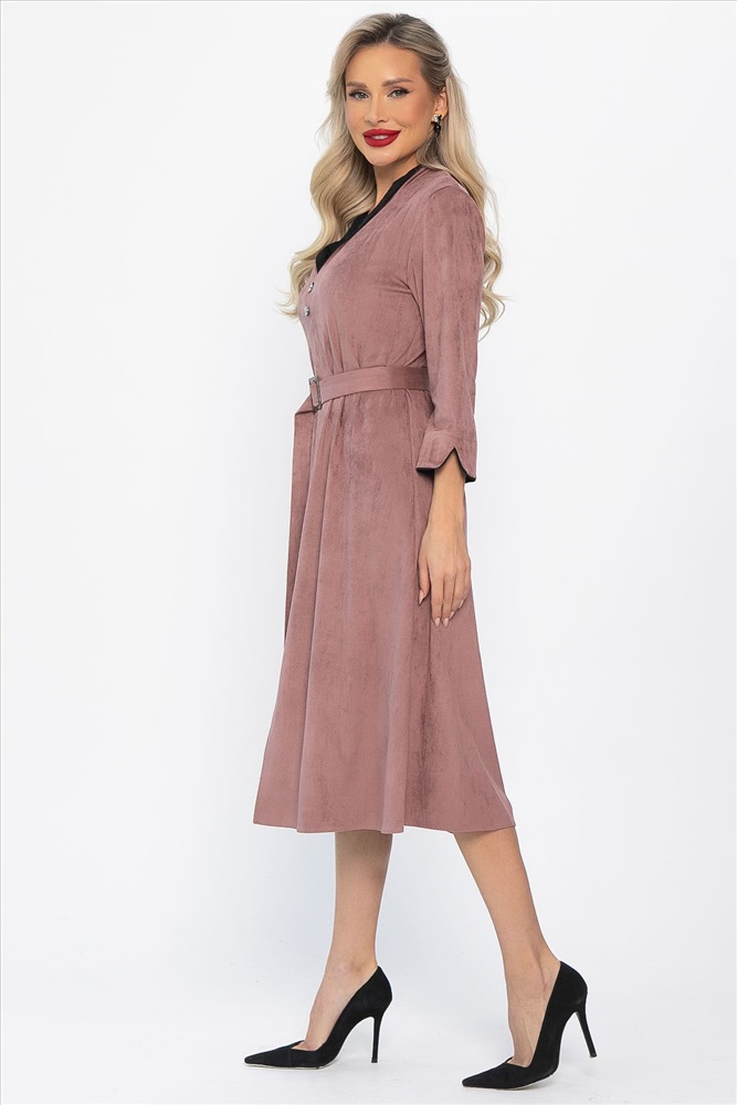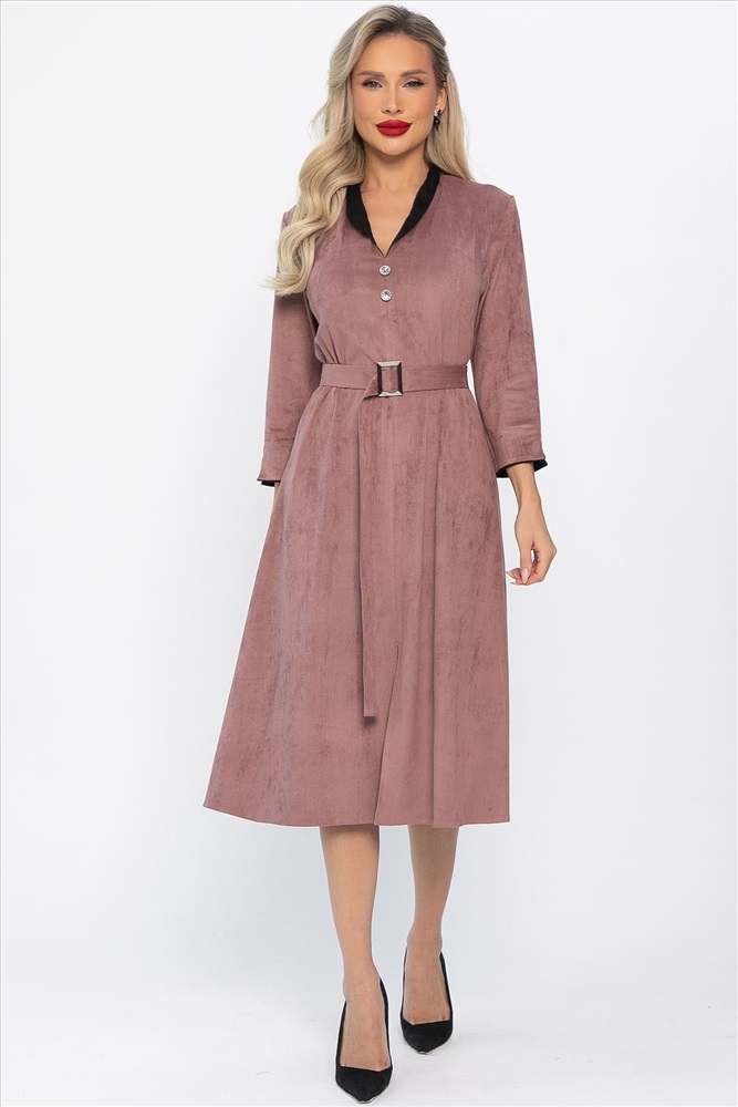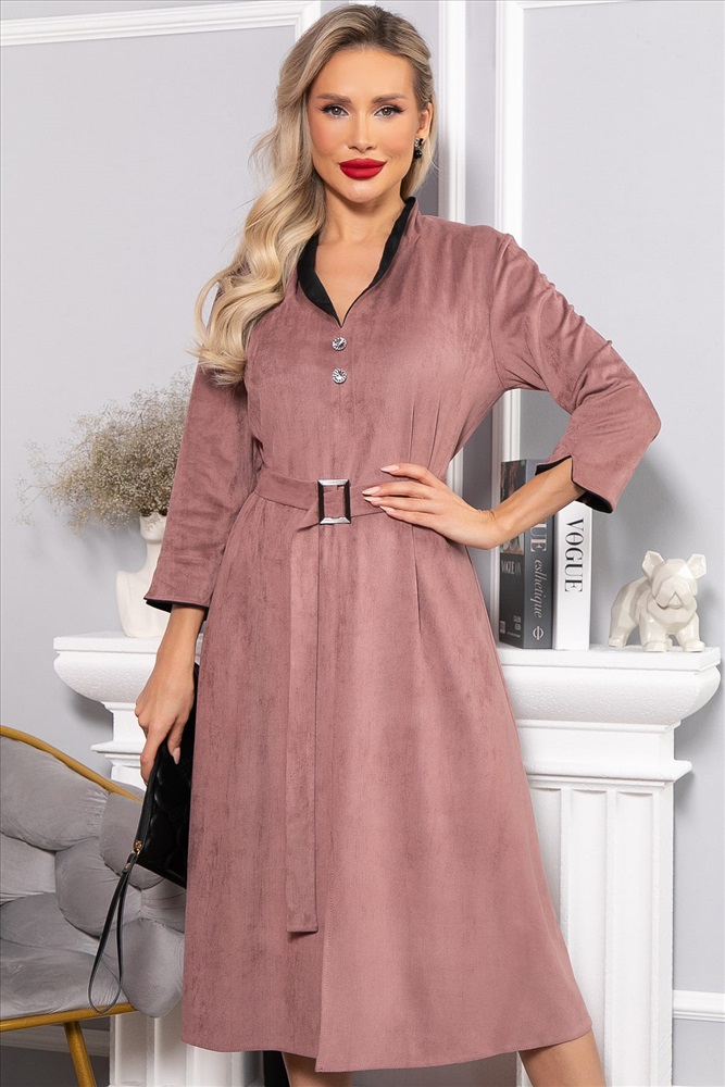 Элегантное платье полуприлегающего силуэта станет идеальным выбором для создания женственного образа! Спереди расположен интригующий разрез, придающий модели особый шарм. Уникальной особенностью этого платья являются декоративные элементы из ткани-компаньона на воротнике-стойке и манжетах рукавов. Втачные рукава длиной три четверти заканчиваются разрезом и украшены манжетами из ткани-компаньона. Воротник-стойка с обтачкой контрастного цвета плавно переходит в разрез у линии груди и продолжается рядом пуговиц до линии талии. В комплект входит пояс с пряжкой.