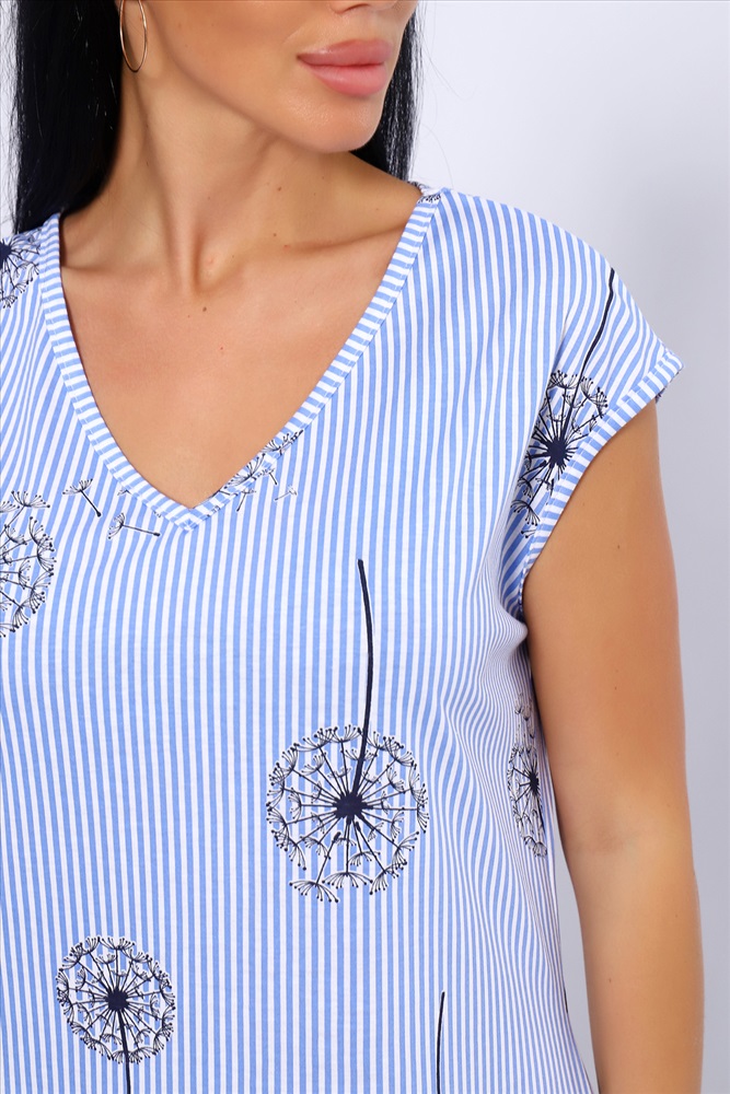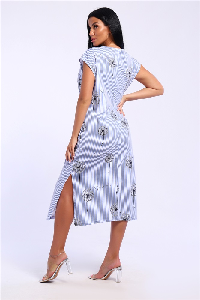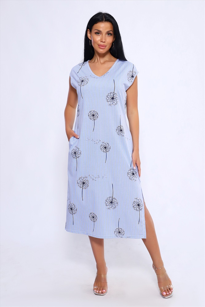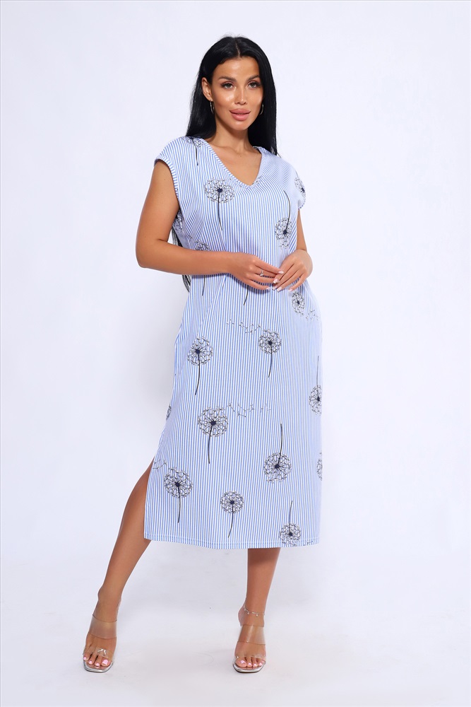 Платье женское из гипоаллергенного, хлопкового, высокого качества компакт пенье трикотажа. Модель слегка приталенного силуэта, фигурный V- образный вырез горловины, безрукавное, в боковых швах удобные карманы, внизу по бокам высокие разрезы. Принт в виде тонкой продольной полоски с изображением легкого, изящного соцветия одуванчика придаст стройности и женственности вашему образу. Летнее миди-платье комфортное, стильное, универсальное подходит для повседневных мероприятий, деловых встреч, а так же вечерних прогулок.
