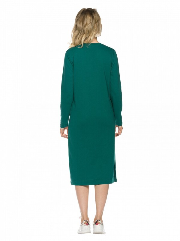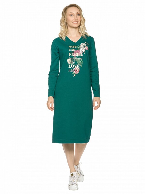 Новинка! Платье женское из мягкого футера прямого силуэта, среднего объема с разрезом в правом боковом шве, со слегка спущенным плечом и стойким эластичным принтом с деликатным золотом и глянцем в шрифте. Перевод: Вы можете чувствовать счастье, если любите искусство.