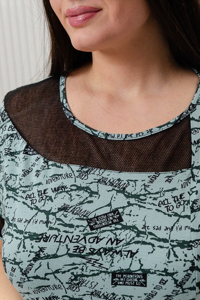 Платье женское полуприлегающего силуэта, расклешенное к низу. Рукав короткий цельнокроеный. Полочка асимметрично разделена по вертикали на две части. Кокетка правой полочки, нижняя часть полочки и рукава, карман из х/б сетки. Вход в карман, горловина и низ рукава окантован бейкой из основной ткани.