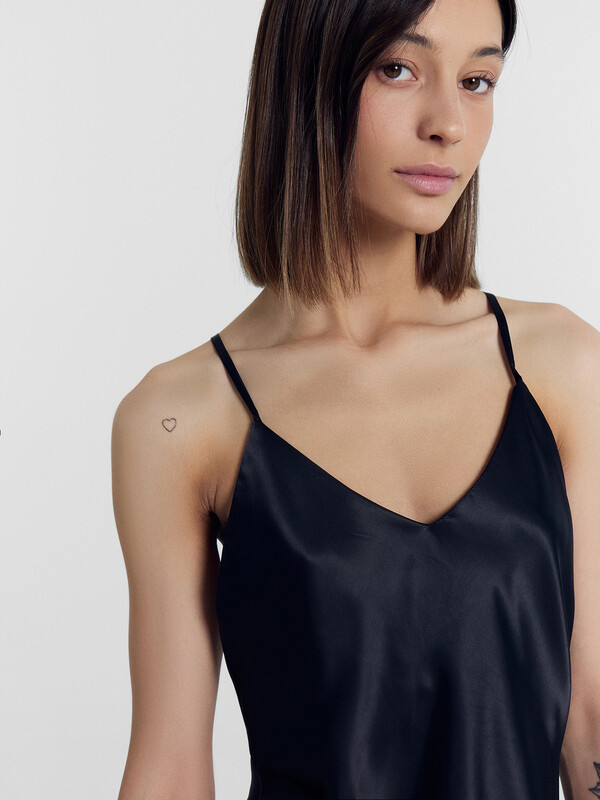 Платье полуприлегающего силуэта. Горловина V-образной формы. Горловина и спинка обработаны обтачкой из основного полотна. Бретели - выворотные, на бретелях регулировка. Низ изделия обработан швом вподгибку.