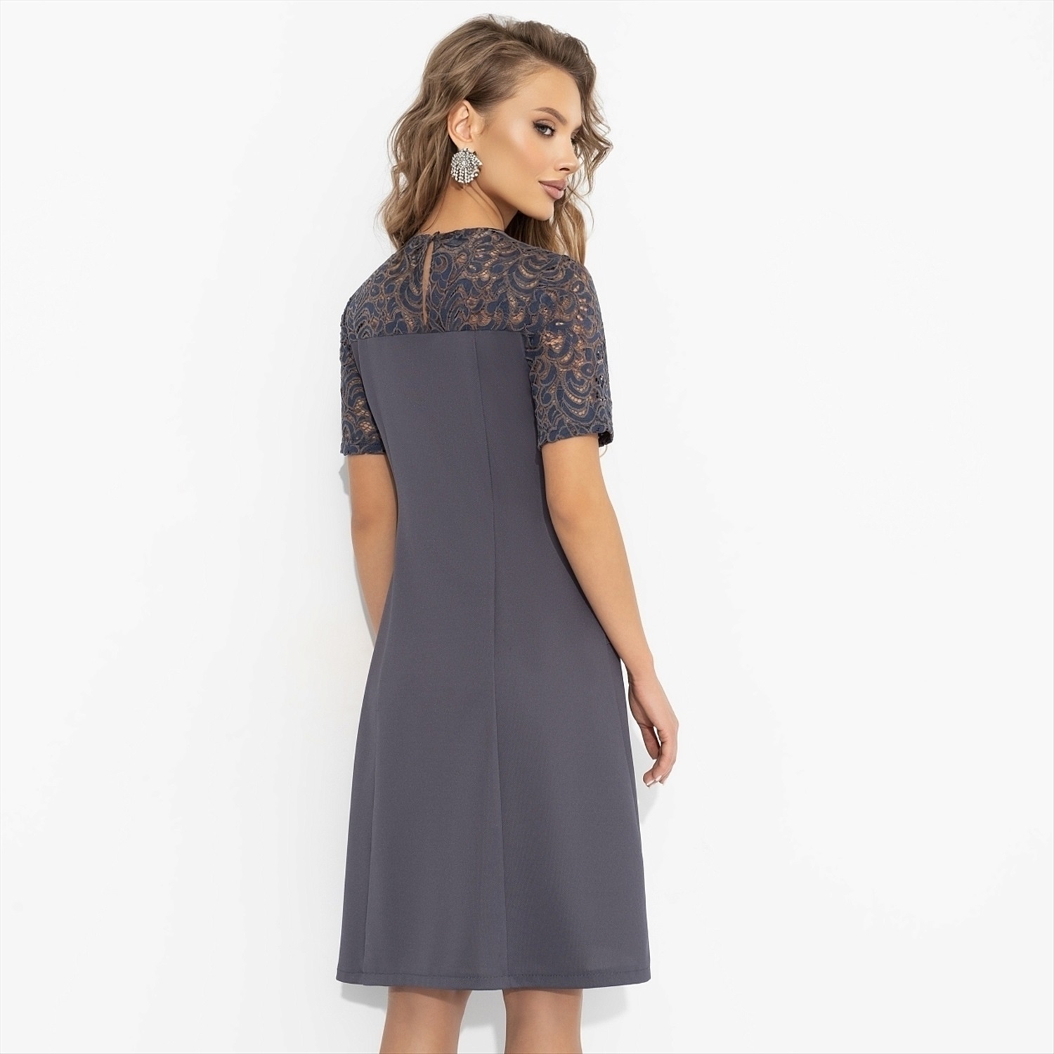 ТН ВЭД: 6104430000; Состав: Трикотаж «диамант», кружево (98% п/э, 2% спандекс); Плотность ткани: Плотная; Тип ткани: Трикотаж; Вид застежки: Пуговица/-ы; Декоративные элементы: Пуговицы; Дополнительный цвет ткани: Синий; Карманы: Нет; Основной цвет ткани: Серый; Отрезная талия: Нет; Подклад: Нет; Резинка по талии: Нет; Рисунок/раппорт: Нет, все изделия идентичны; Сезон: Круглогодичный; Силуэт: Приталенный; Стиль: Повседневный