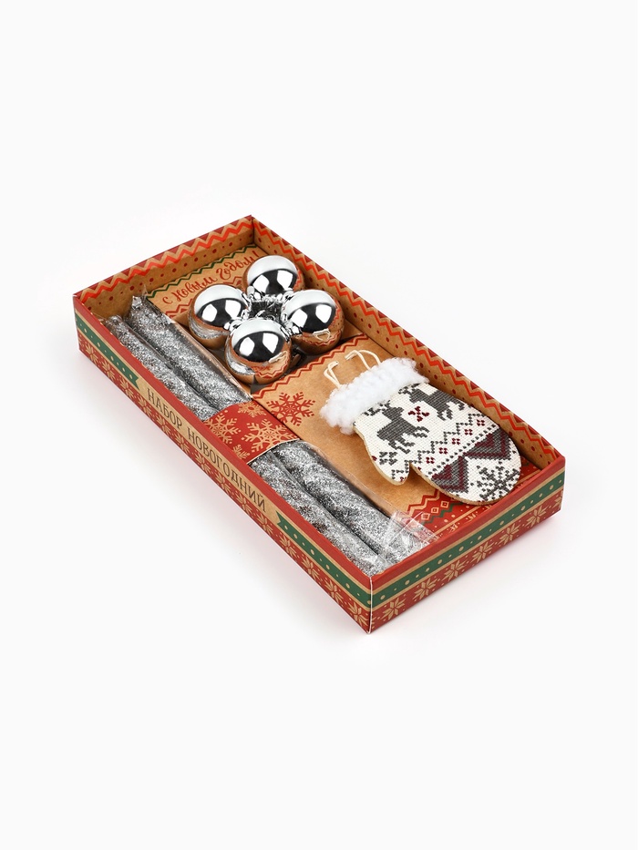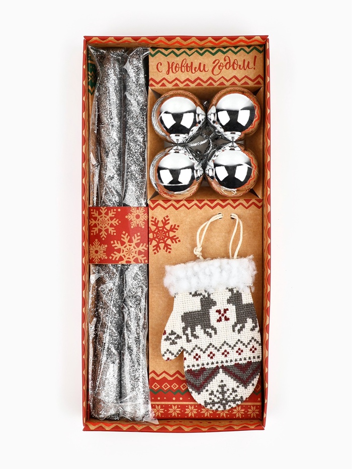 Набор витых свечей с декором прекрасно впишутся в любой новогодний интерьер и создадут праздничное настроение. Такой подарок отлично подойдет для подарка вашим родным и близким, благодаря красивой упаковке. В набор входит 2 античные свечи (1,5 х 1,5 х 20 см.), 4 елочных шара (2,5 х 3,5 см.) и подвеска на елку в виде варежки (5,5 х 0,5 х 8,5 см.)