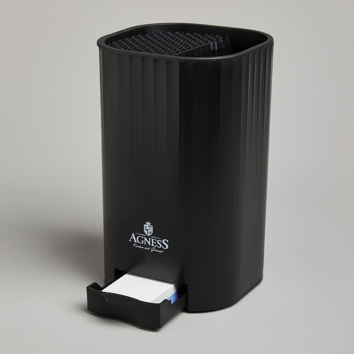 * Сохраняет остроту кромки ножа. * Подходит для ножей разной длины * Компактное хранение ножей и кухонных аксессуаров * Легко чистить и мыть. Верхняя часть съемная * Точильный камень в комплекте Точильный камень имеет 2 уровеня заточки. 800/2000 грит 800 грит - для выравнивания лезвия 2000 грит - для остроты лезвия Перед началом заточки точильный камень необходимо смочить водой. Начинайте заточку ножей со стороны, обладающей большей зернистостью (800 грит), затем перейдите на мелкозернистую сторону (2000 грит). Комментарии к товару