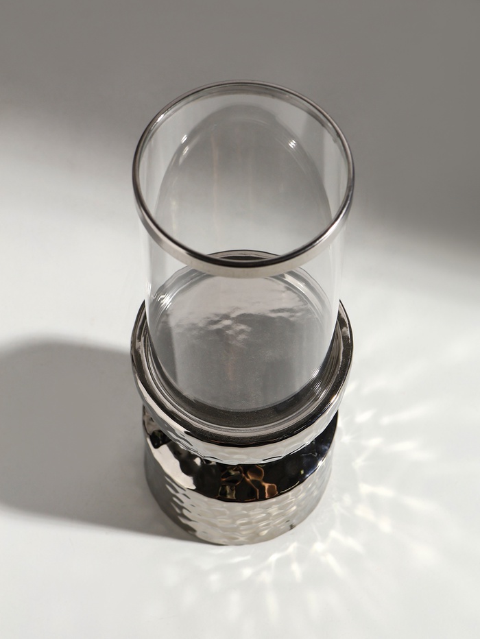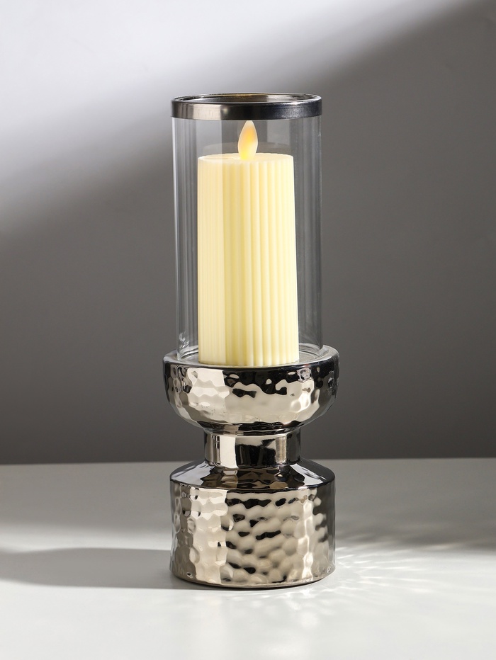 Габариты: 29,5 x 11 x 11; Страна: Китай; В боксе: 24 шт; Состав: Керамика, стекло; Материалы: керамика, стекло; Фасовка: по 1 шт; Индивидуальная упаковка: Картонная коробка; Габариты товара: 9,5 см × 9,5 см × 26 см; Сертификат: Не подлежит сертификации; Набор: Нет; Цвет: Серебристый; Высота, см: 26; Количество рожков: 1; Диаметр под свечу, см: 8; Вид упаковки: Коробка картонная; Символ года: Нет; Тематика праздника: Универсальная тематика; Адресат: Без адресата; Материал: Керамика; Свеча в комплекте: Нет; Фиксированная цена: Да