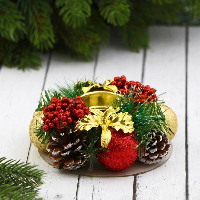 Подсвечник с ягодным декором и золотисто-красным оформлением высотой 6 см предназначен для одной свечи диаметром 4 см. Его дизайн объединяет элементы ар-деко, классики и новогоднего барокко, подчёркивая праздничную атмосферу и гармонично вписываясь в разные стили интерьера.