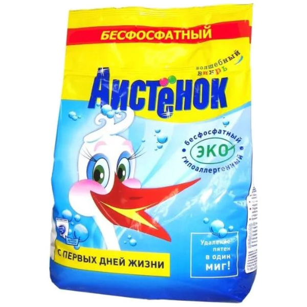 Бренд: Аистенок; Индивидуальная упаковка: Пакет цветной; Серия: Аистенок; Материал: -; ШтрихКод: 4600905002282; Страна происхождения: Россия; Вид: Порошок; Особенности: Гипоаллергенность; Вес (гр): 2400; Отдушка: Без отдушки