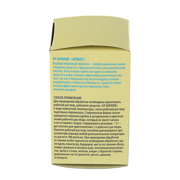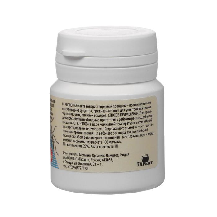 Профессиональный концентрат для борьбы с клопами "Атлант", банка, 5 г Назначение: для уничтожения клопов.Препарат эффективен против клопов, которые устойчивы к большинству средств. Порошок перед применением необходимо смешать с 1 л воды. Раствор не оставляет следов и запаха. Образует стойкую невидимую плёнку, после контакта с которой насекомые гибнут в течение нескольких часов.Действующее вещество: ацетамиприд (20 %). Способ применения: для проведения необходимо приготовить рабочий раствор, добавляя средство к воде комнатной температуры, затем тщательно перемешать.