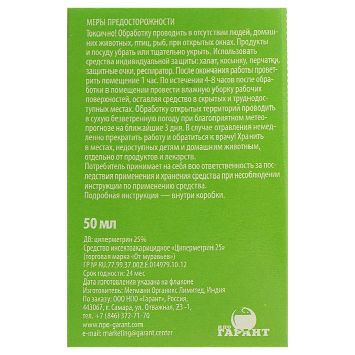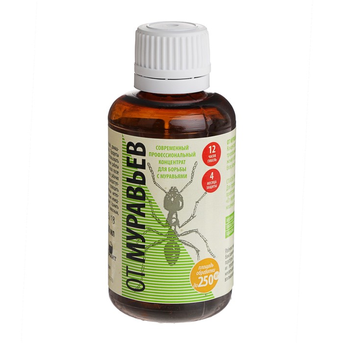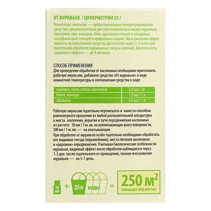 ОписаниеНазначение: для уничтожения всех видов муравьёв, тараканов, мух, блох, комаров, крысиных и энцефалитных клещей в природных стациях.Профессиональное средство выпускается в форме концентрата эмульсии, адаптировано для бытового применения. Представляет из себя жёлтую прозрачную жидкость, которую перед использованием необходимо развести водой. Результат виден через 1–3 дня при тщательной обработке гнёзд и колоний. Длительность эффекта — до 4 месяцев.Действующее вещество: циперметрин (25 %).Применение: Площадь обработки 1 флакон 50 мл = 250 м2;форма концентрата широко используется в профессиональной дезинсекции, что гарантирует высокую эффективность препарата;благодаря АДВ из самой широко применяемой химической группе инсектицидов, средство «От муравьев» эффективно уничтожает ползающих насекомых: все виды муравьев, тараканов, блох;рекомендуется к применению для уничтожения летающих насекомых: комаров, мух, при этом экономическая эффективность использования определяется достаточностью проведения 1-2 обработок за сезон;средство «От муравьев» рекомендован НИИ Дезинфектологии для обработки территорий от клещей – переносчиков возбудителей клещевого энцефалита и клещевого боррелиоза;средство «От муравьев» является профессиональным средством, поэтому требует особо тщательного соблюдения инструкции по применению и мер предосторожности.