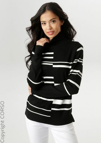 Artikelfarbe: schwarz-offw Marke: Aniston SELECTED Sortiment: Da. Strick/ Sweat Größen-Kategorie: Normalgrößen Inverkehrbringer: AproductZ GmbH, Werner-Otto-Straße 1-7, 22179 Hamburg, Deutschland, E-Mail- customer-service@aproductz.com Pullover im extravaganten Streifen-Dessin, Überschnittene Schultern, Mit Ripp-Strick-Bündchen am Rollkragen, dem Saum und den langen Ärmeln, Aus weichem Feinstrick, Figurumspielende Passform, Obermaterial: 70% Viskose, 30% Polyamid, N-Gr