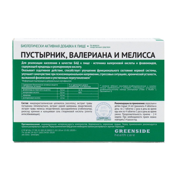 Производитель: Green Side; Габариты: 11 x 7,5 x 3; Страна: Россия; В боксе: 25 шт; Состав: См. на упаковке; Материалы: см. на упаковке; Фасовка: по 1 шт; Индивидуальная упаковка: Цветная картонная коробка; Сертификат: ЕАС; Назначение: Для иммунной системы, Успокоительное; Форма выпуска: Таблетки; Показания: Стресс, Повышенная нервная возбудимость; Компоненты: Пустырник, Корень валерианы, Мелисса; Действие: Успокоительное