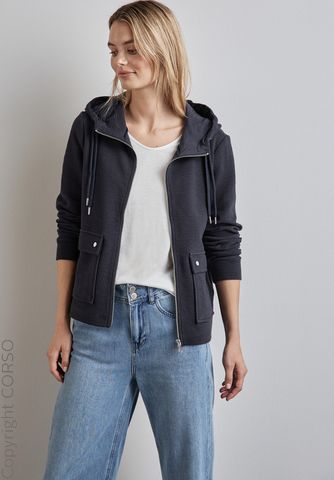 Artikelfarbe: night sky Marke: STREET ONE Sortiment: Da. Sweat-Shirt Größen-Kategorie: Normalgrößen Inverkehrbringer: Street One GmbH, Imkerstr. 4, 30916 Isernhagen-Kirchhorst, Deutschland, Tel.- +49 (5136)9773-0, E-Mail- info@de.street-one.com Strukturjacke von CECIL, Ein angenehmer Baumwollmix mit Stretchanteil bietet hohen Tragekomfort, Gerader Schnitt, Reißverschluss und die seitlichen Taschen mit Knopf, Modisch durch den Alltag, Obermaterial: 96% Baumwolle, 4% Elasthan, N-Gr