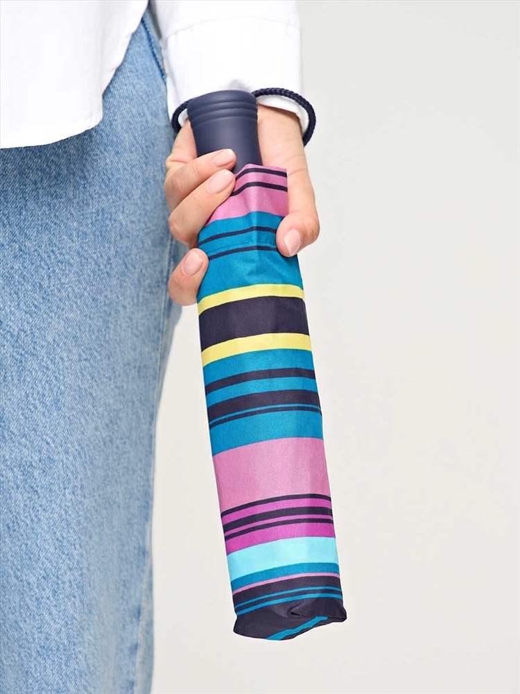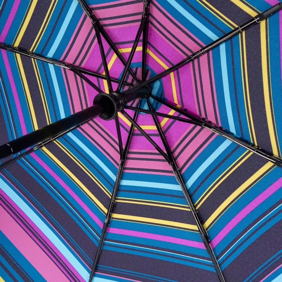 Материал спиц: алюминий, фибергласс, Динамичность, ритм, яркость – этот многоцветный аксессуар будет поддерживать практически любые тона в гардеробе. В продаже есть модель с похожей расцветкой и общей сиреневой доминантой, только здесь акцент сделан на пурпуре, а там – на желтом цвете. Такие аксессуары могут быть парными и подходят для подарка подругам или для создания семейного гардероба: модная тенденция, когда члены семьи носят перекликающиеся вещи и аксессуары. Это надежный зонт с ветроустойчивым каркасом и большим куполом (104 см). Ручке не скользит в ладони благодаря специальному покрытию. Чехол украшает изящная подвеска с логотипом.
