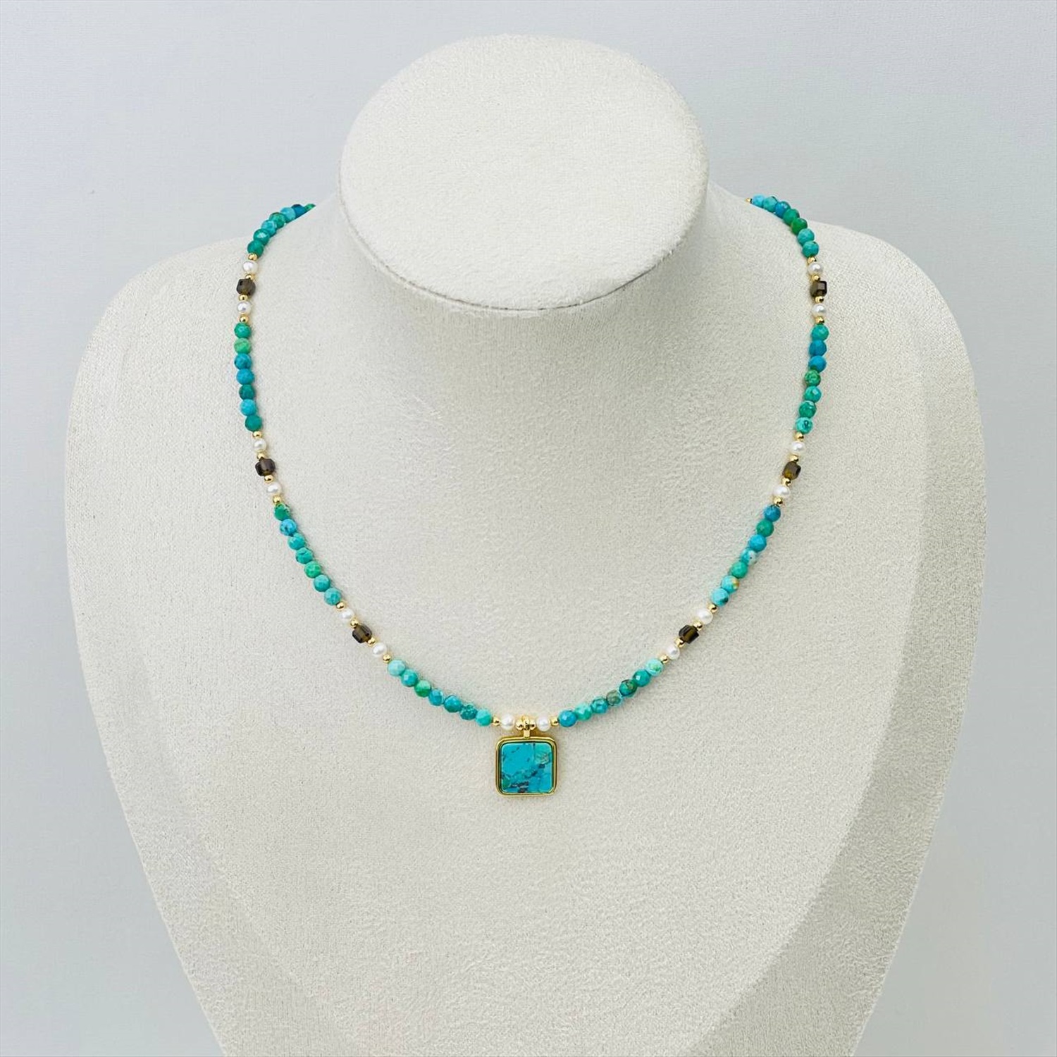 Цвет камня: Миксовый Месторождение: Хубэй Камень: Бирюза Вставка: Жемчуг Покрытие: Золото 14К Диаметр: 3,5 мм Поверхность: Граненный/Необработанный Производитель: Радуга Самоцветов (Россия) Тип замка: Карабин с цепочкой Комментарии к товару