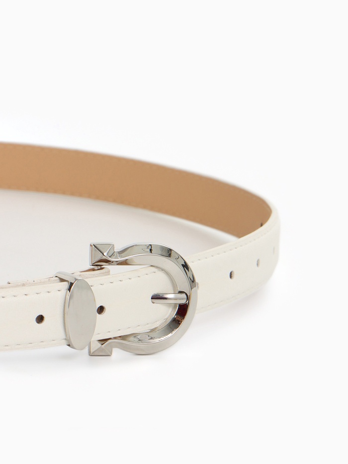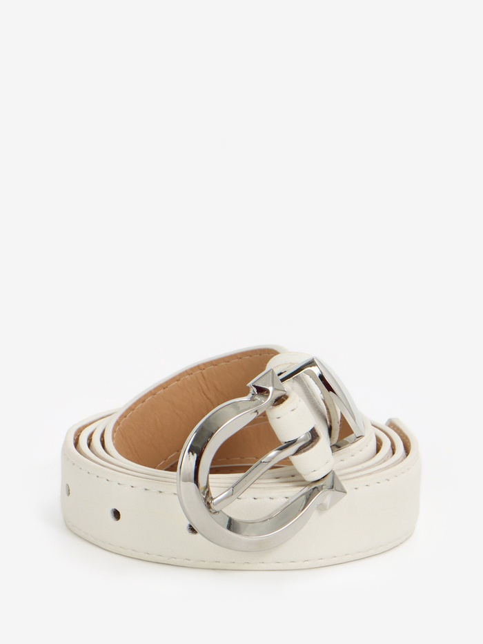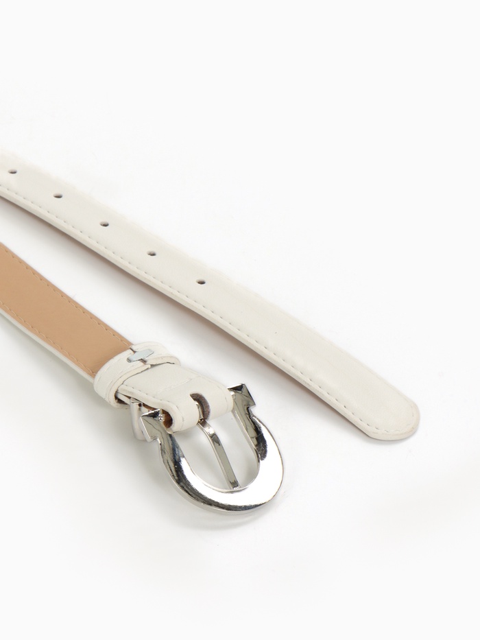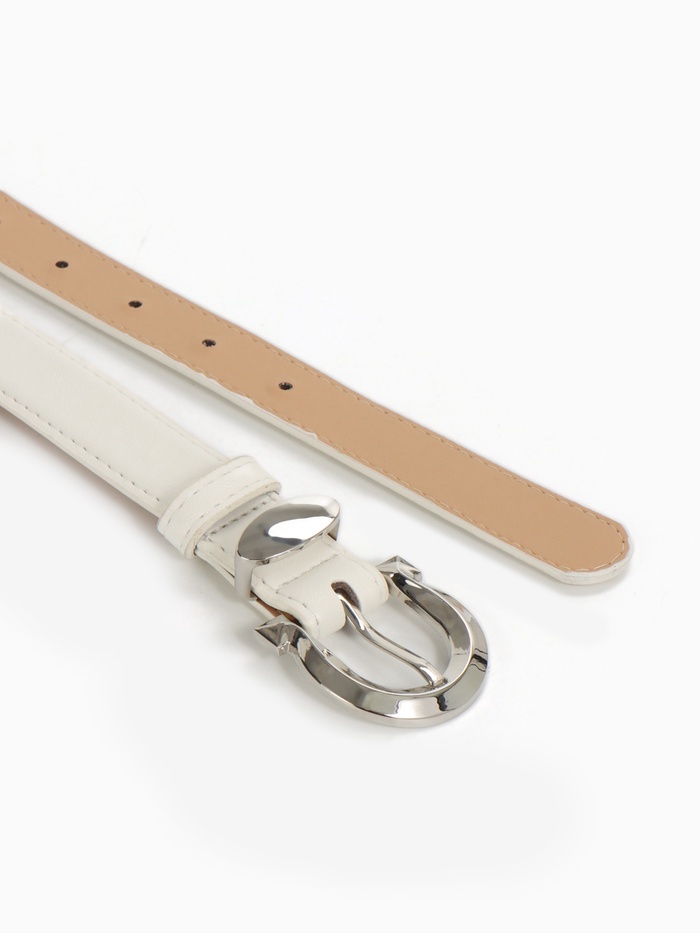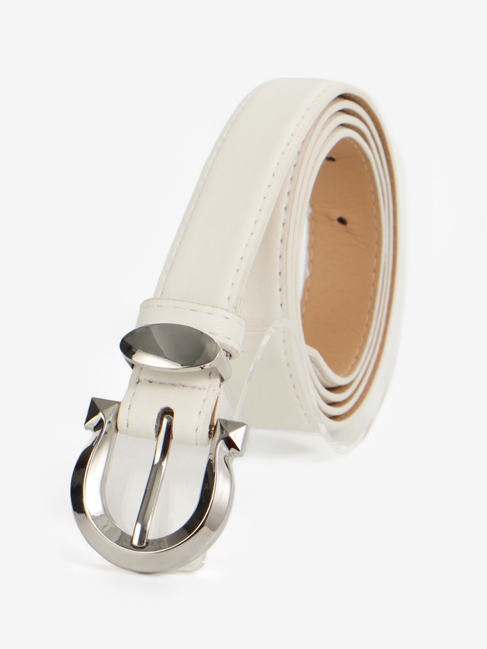 Белый кожаный ремень с серебряной пряжкой — свежий акцент для летних образов. Универсальная ширина делает его идеальным выбором для платьев и брюк.