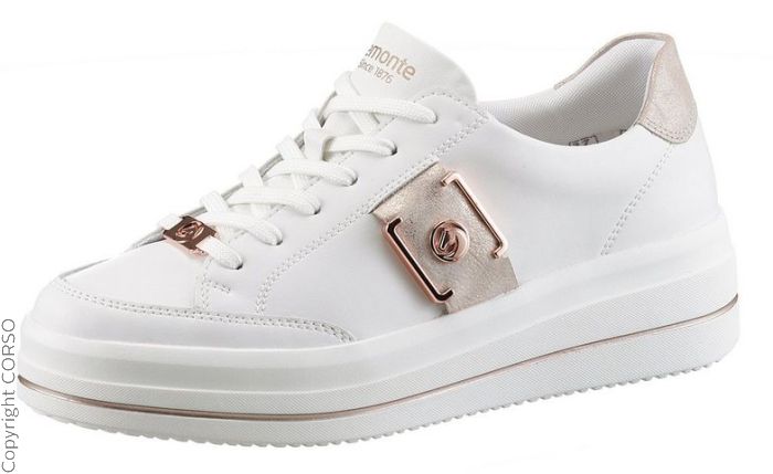 Artikelfarbe: weiß-roségol Marke: Remonte Sortiment: Da. Schuhe Größen-Kategorie: Normalgrößen Inverkehrbringer: RDG - Rieker Dienstleistungsgesellschaft mbH, Gänsäcker 31, 78532 Tuttlingen, Deutschland, E-Mail- info@rdgmbh.net Plateausneaker mit Schmuckelement und Kontrastbesatz, Obermaterial im Mix aus hochwertigem Leder und Lederimitat, Innenausstattung aus weichem Textil, Gepolstertes und herausnehmbares Fußbett mit remonte Soft Foam Ausstattung, 4,5-cm-Keilabsatz und 3,5-cm-Plateausohle, EURO