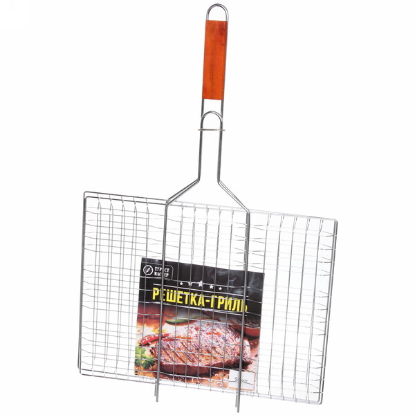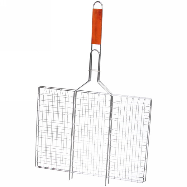Решетка-гриль плоская с антипригарным покрытием 40*30 см Неоспоримое преимущество решетки перед шампурами в том, что продукцию можно готовить порционно, будь то рыба, антрекоты, эскалопы, колбаски, птичьи крылышки или ножки, овощи и т.д. Гриль-решетку можно использовать для приготовления различных блюд как на открытом огне, так и в камине. Деревянная ручка дает возможность, не опасаясь ожогов, переворачивать решетку, а антипригарное покрытие избавит Вас от проблем, связанных с чисткой поверхности решетки. Гриль-решетка очень удобна при транспортировке, т.к. в сложенном виде она совершенно плоская, без колющих и режущих углов. Как пользоваться: подготовленный продукт выкладывают на одно из полотен решетки, прикрывают другим полотном и фиксируют крепежным кольцом. Затем располагают решетку над углями.